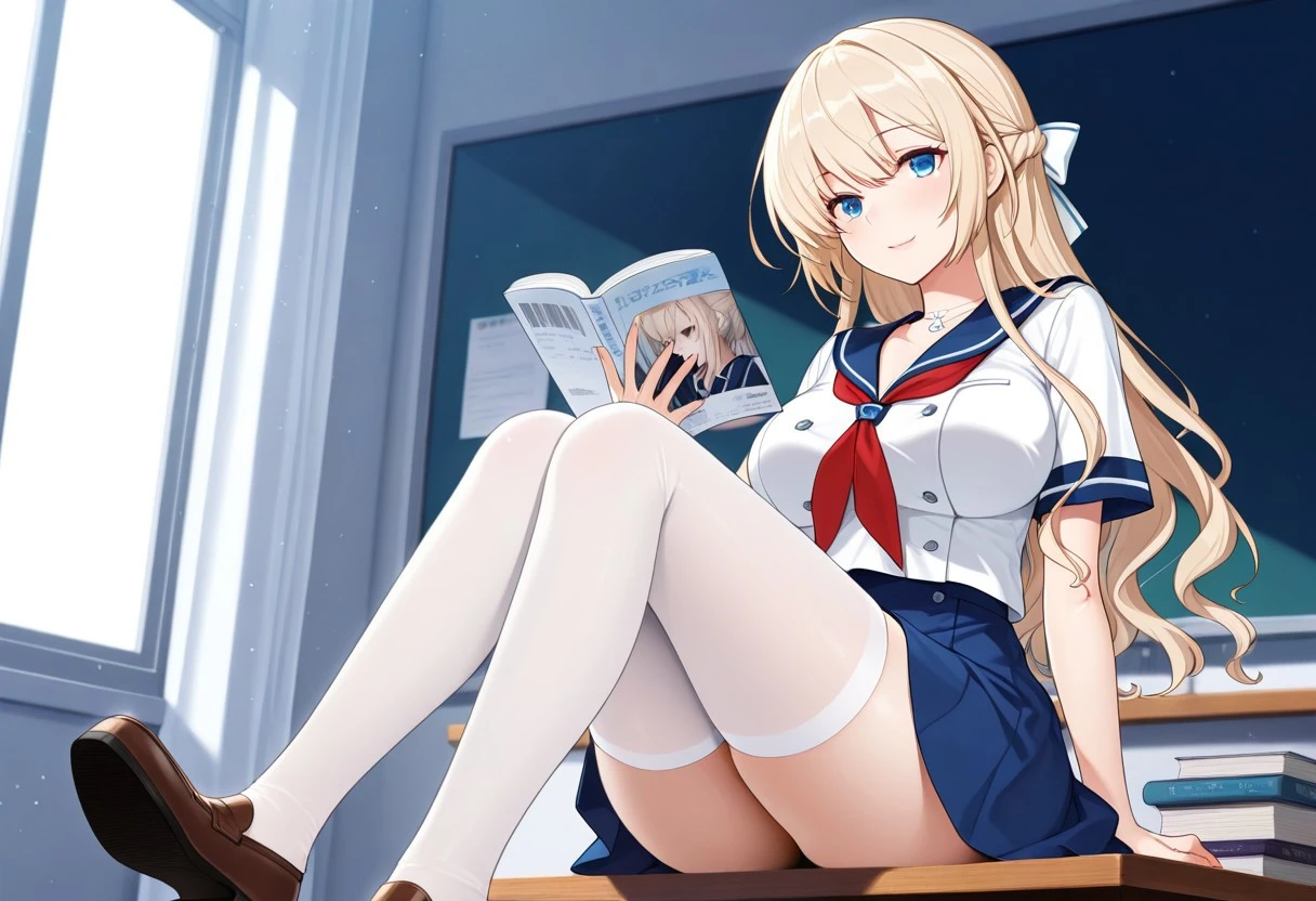 uniform, short sleeves, sailor collar, blue skirt, zertai ryouiki, white thighhighs, brown loafers,
