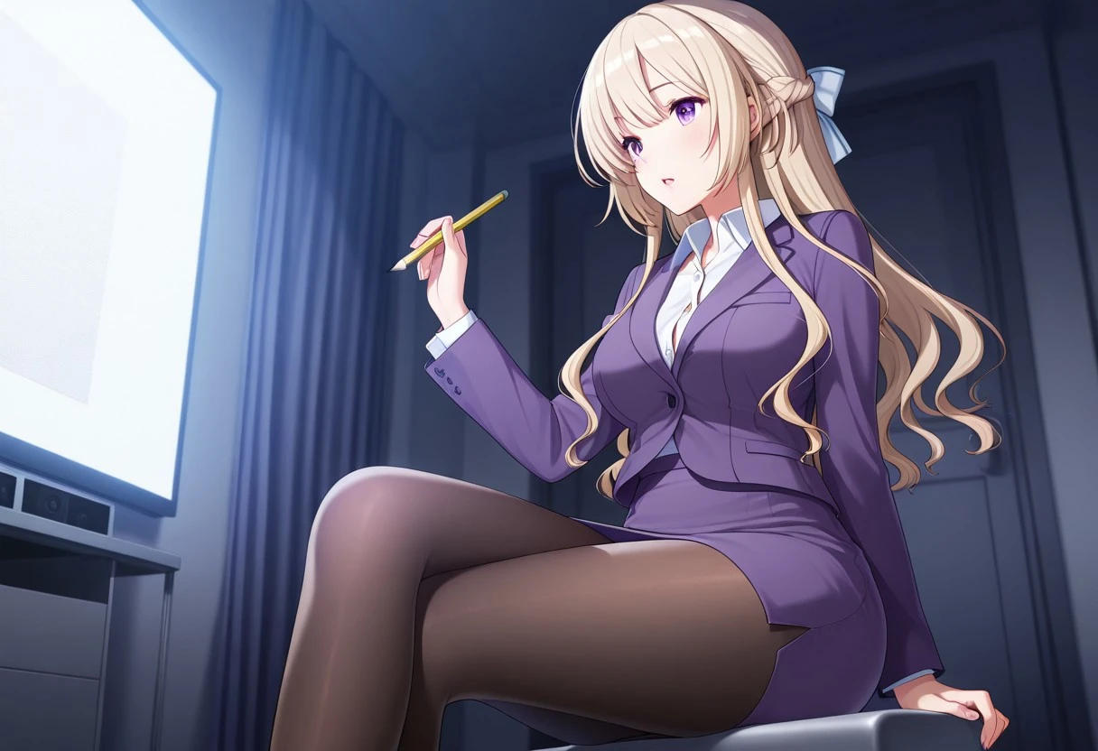 -Work: work clothes, skirt suit, purple jacket, wing collar, purple skirt, pencil skirt, pantyhose, white shirt, collared shirt, shirt buttons, white high heels,