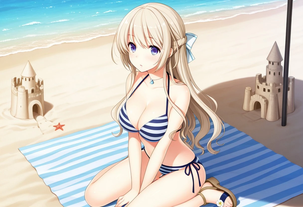 striped bikini, side-tie bikini bottom, cleavage, sandals,
