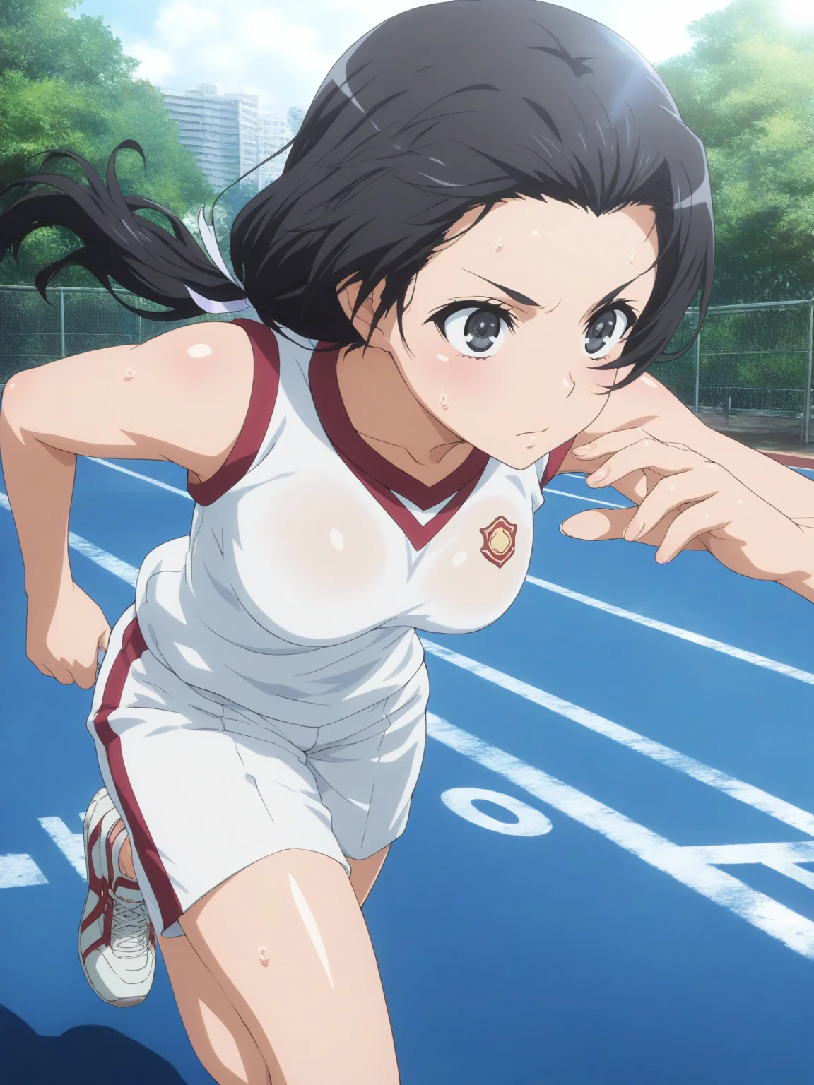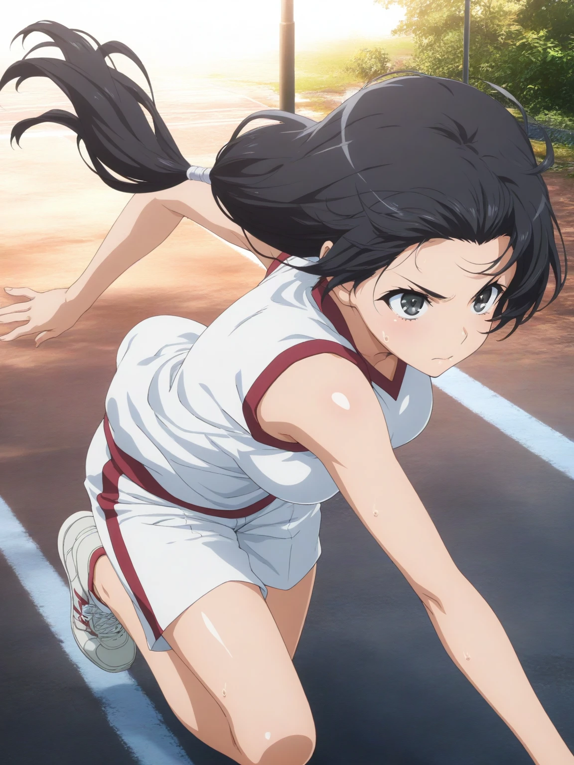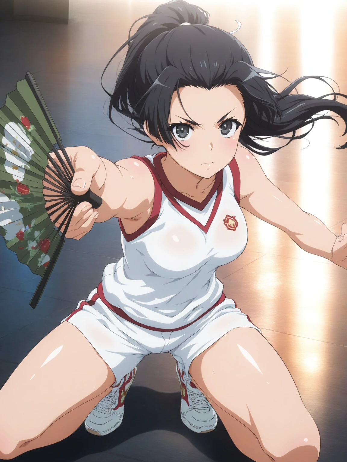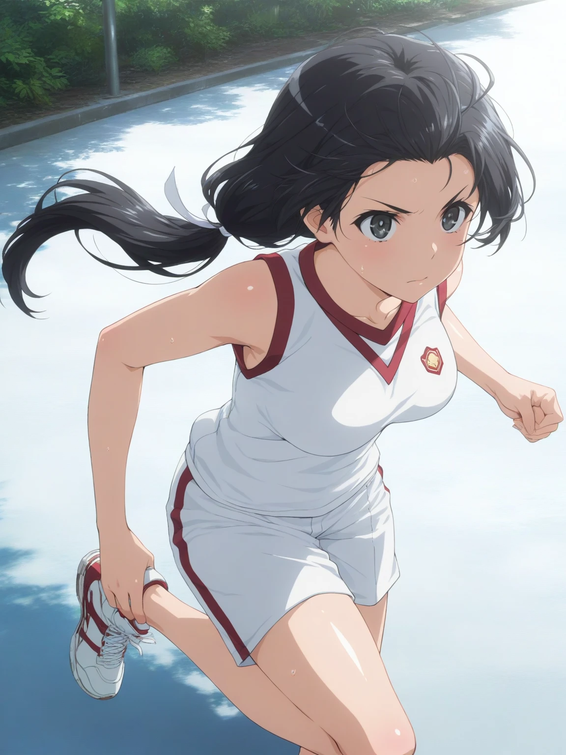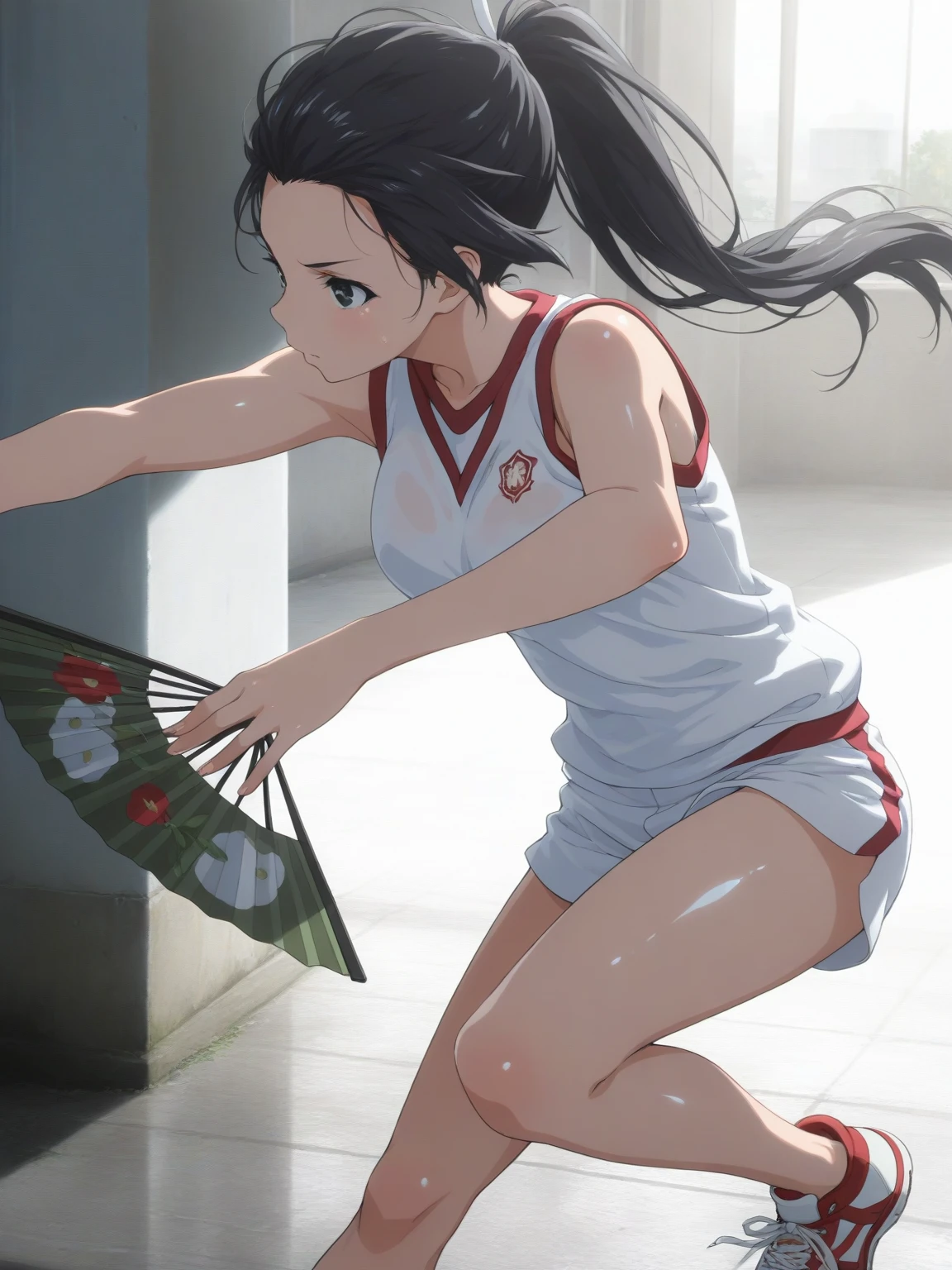 Gym: (KongouGym, black eyes, black hair, loose ponytail), white shirt, sleeveless shirt, white shorts, sneakers,