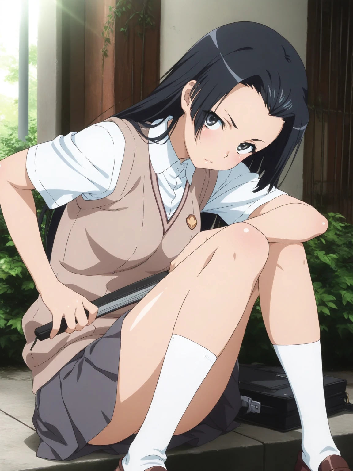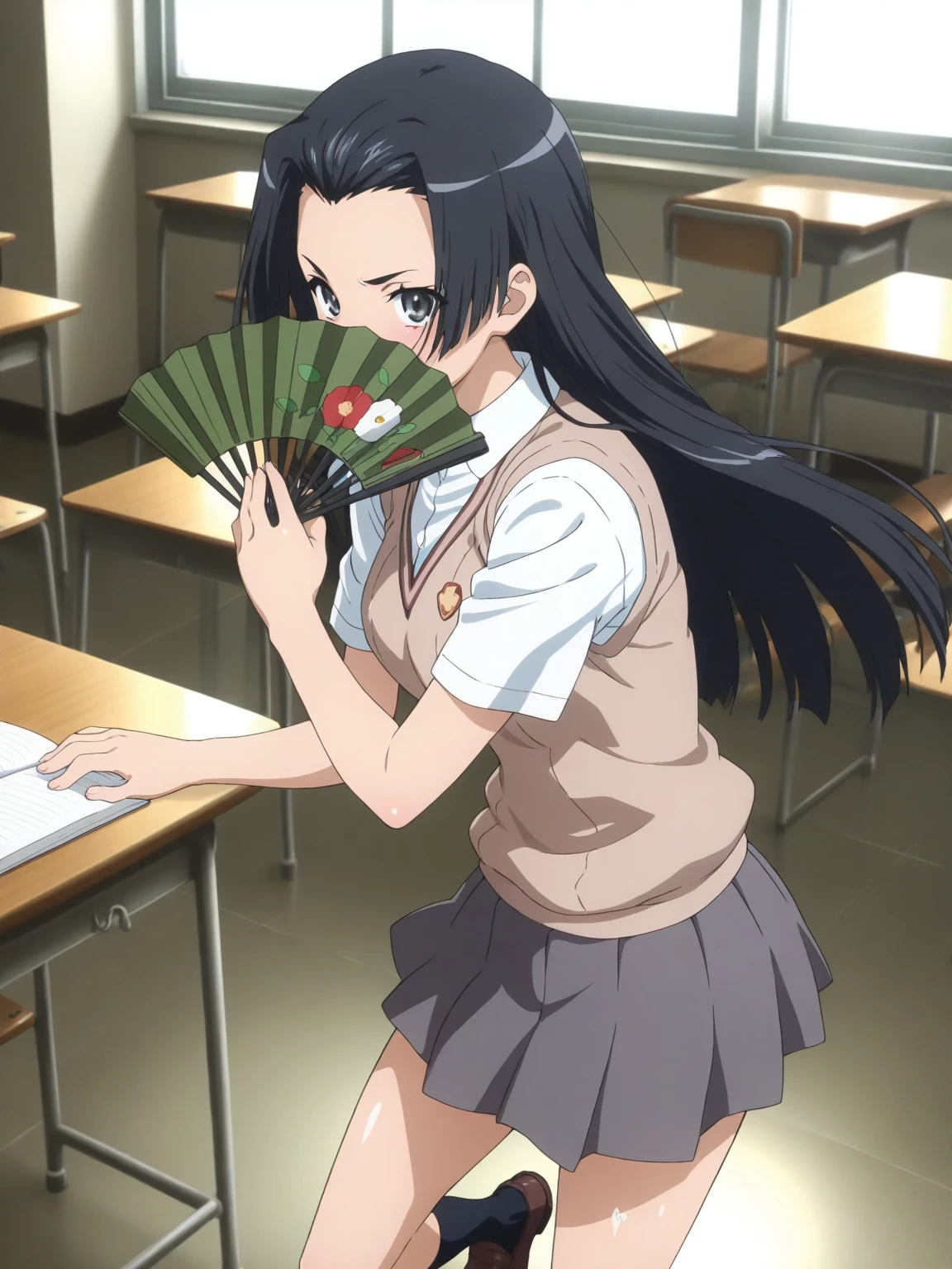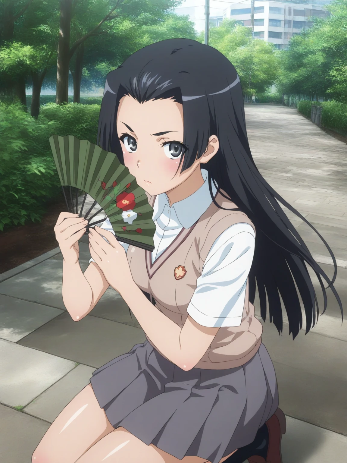 Uniform: (KongouUniform, black eyes, black hair, long hair), tokiwadai school uniform, sweater vest, white collared shirt, short sleeves, pleated skirt, socks, loafers, hand fan
