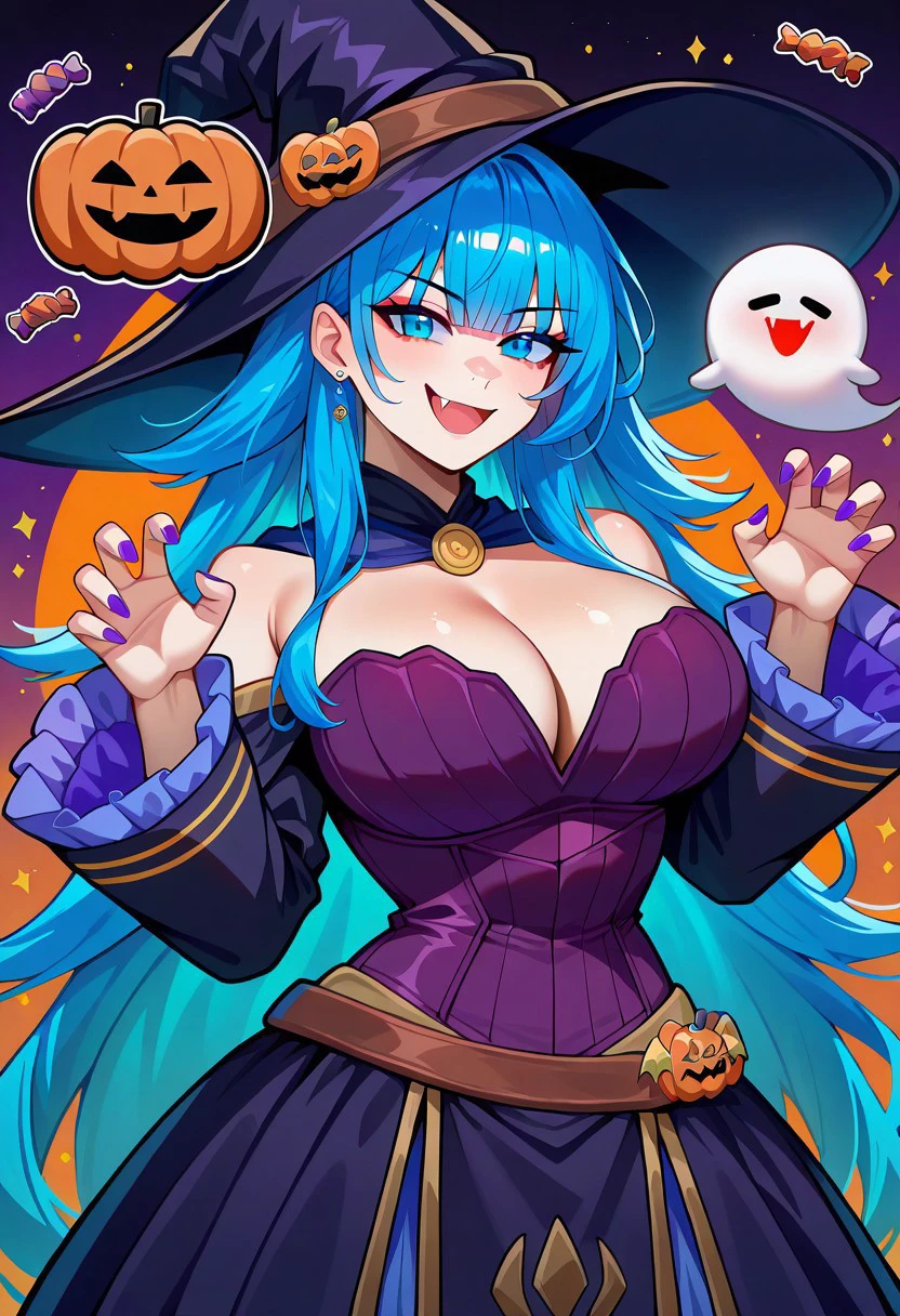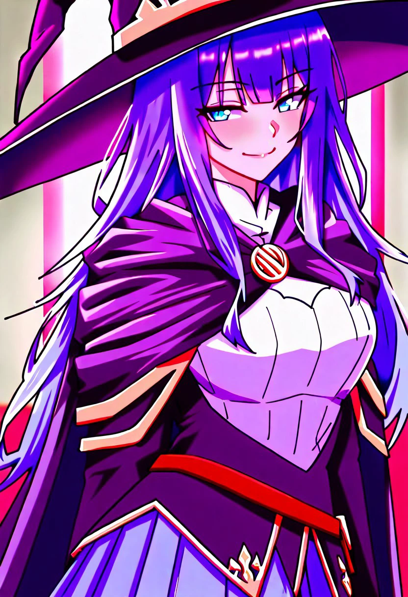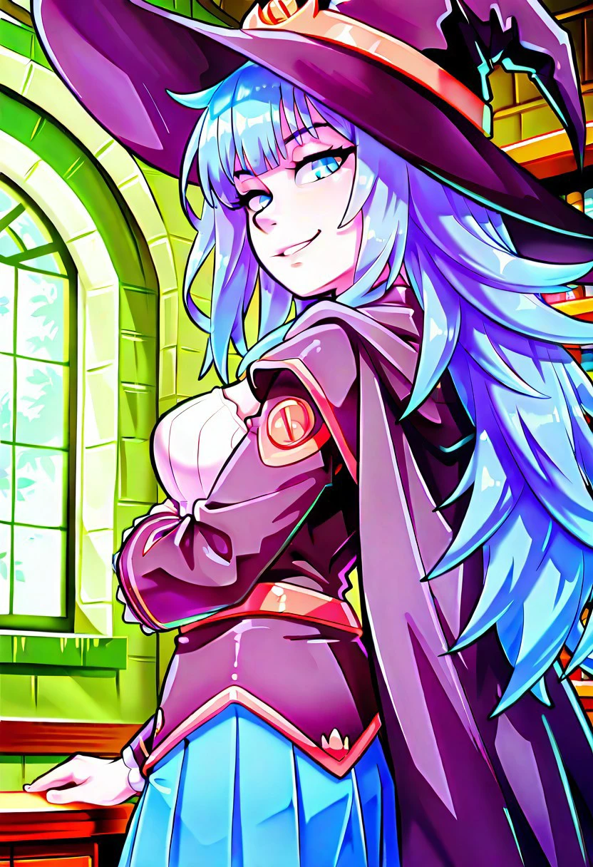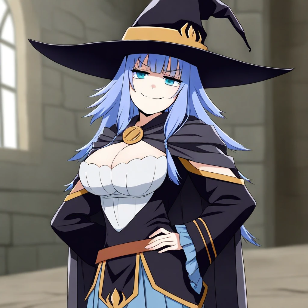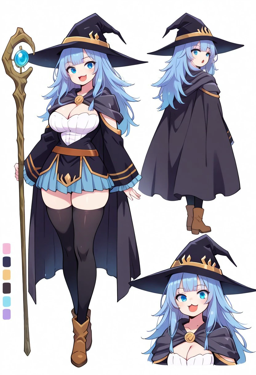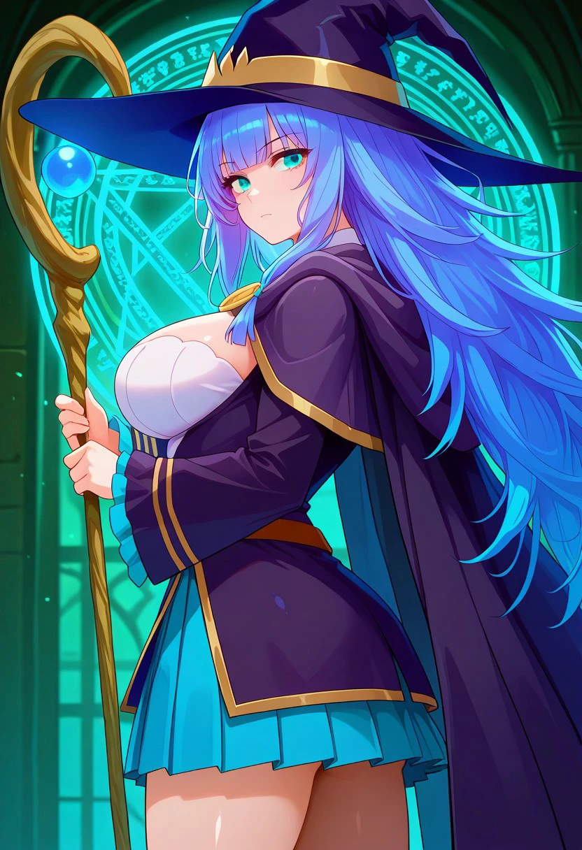 witch hat, cape, breasts, blue pleated skirt, thighhighs, magic staff