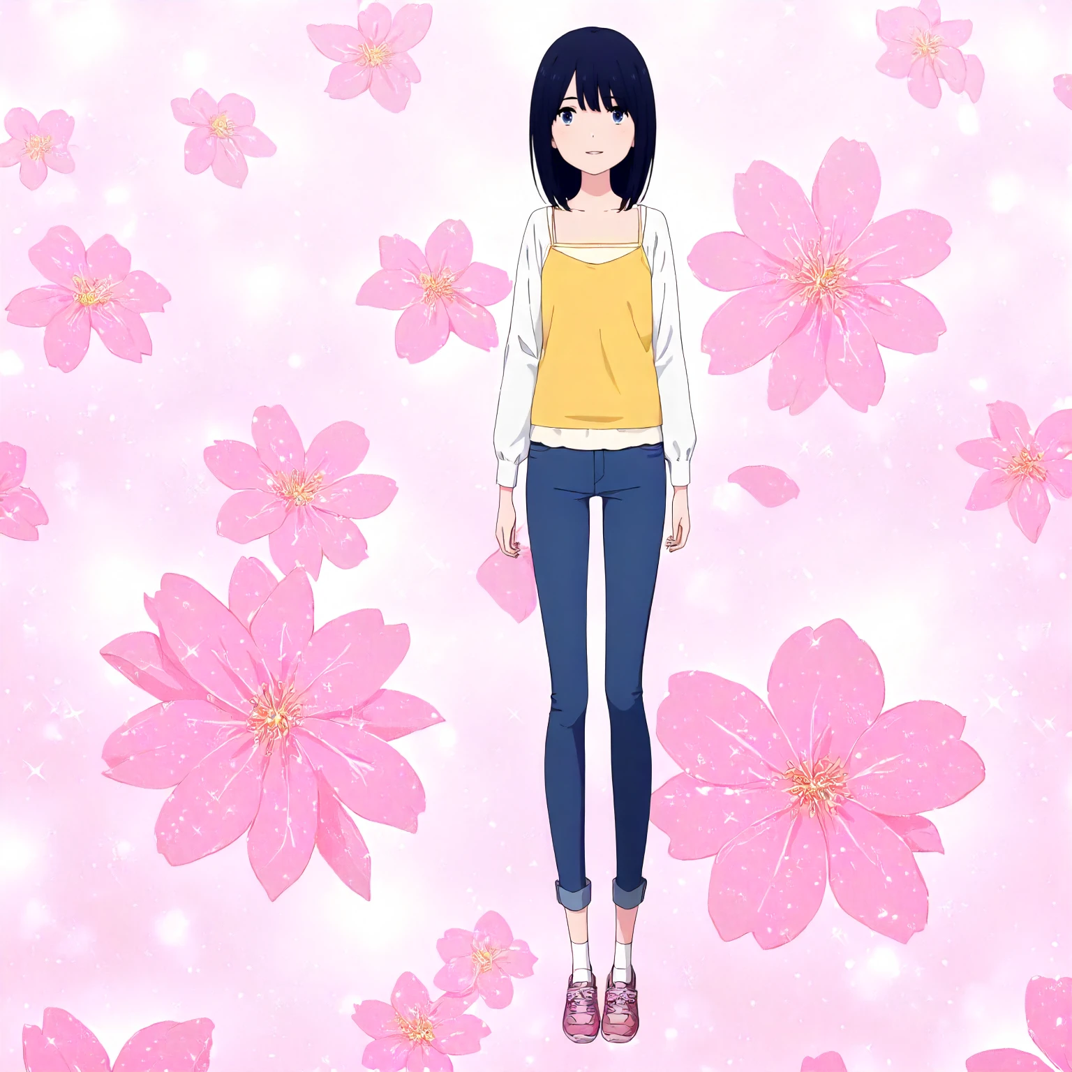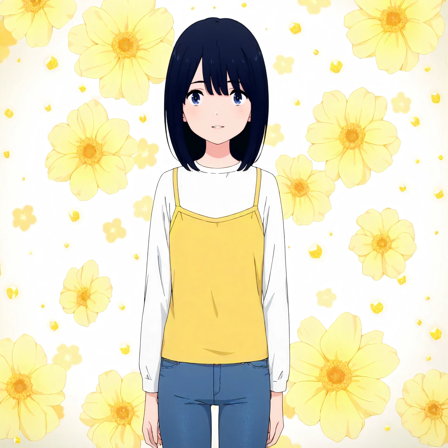 white shirt,long_sleeves,layered camisole,yellow camisole, jeans pants,
