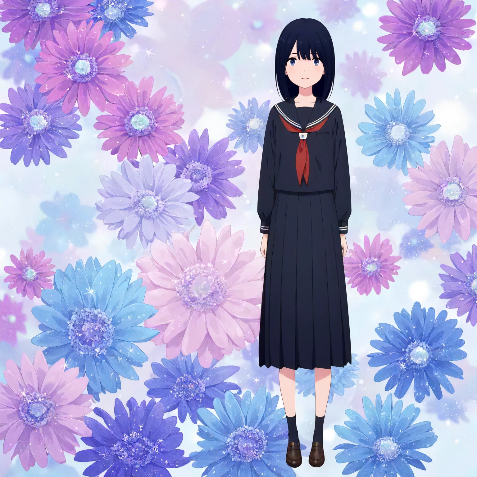 black sailor collar,red_neckerchief,black shirt,long_sleeves, black skirt,pleated_skirt,