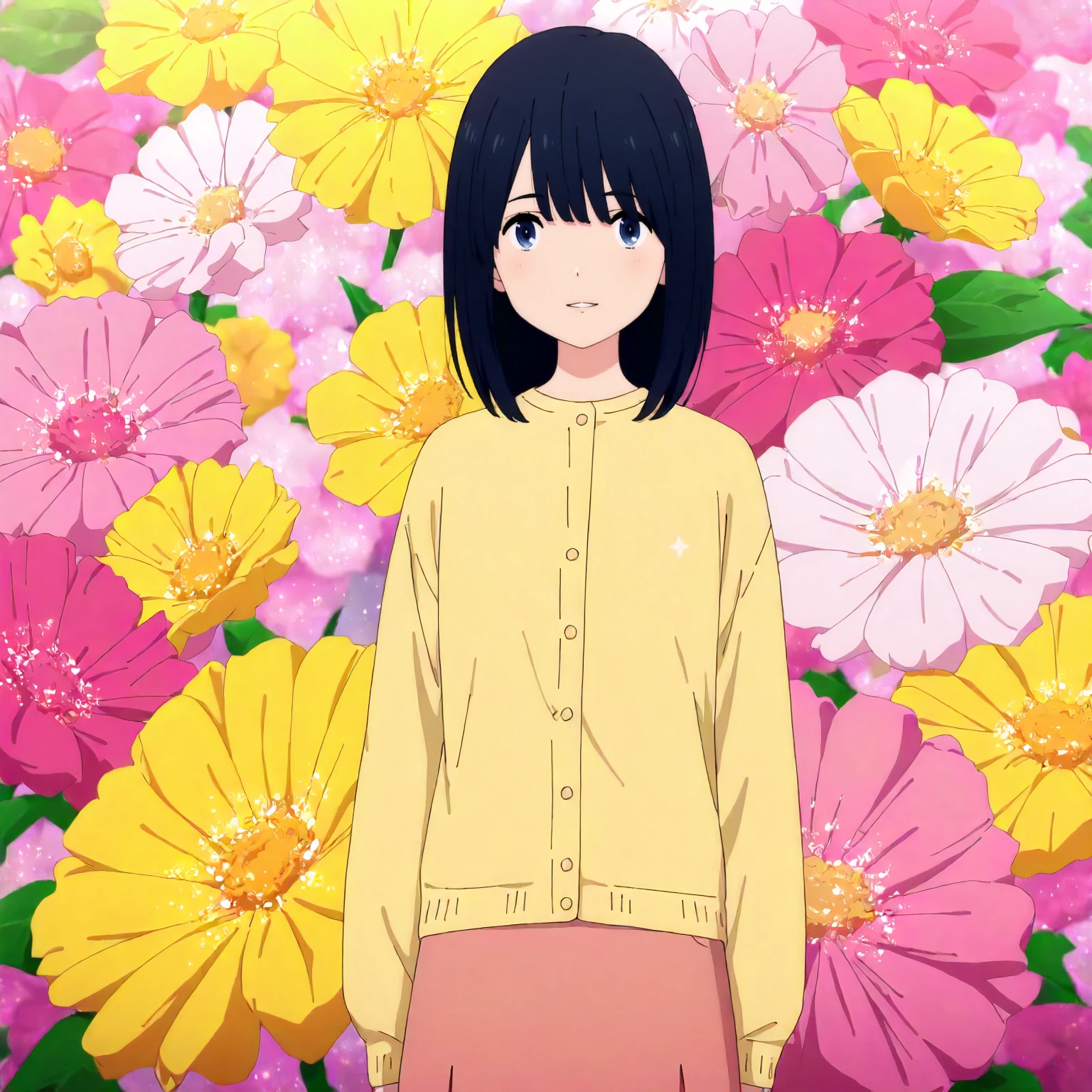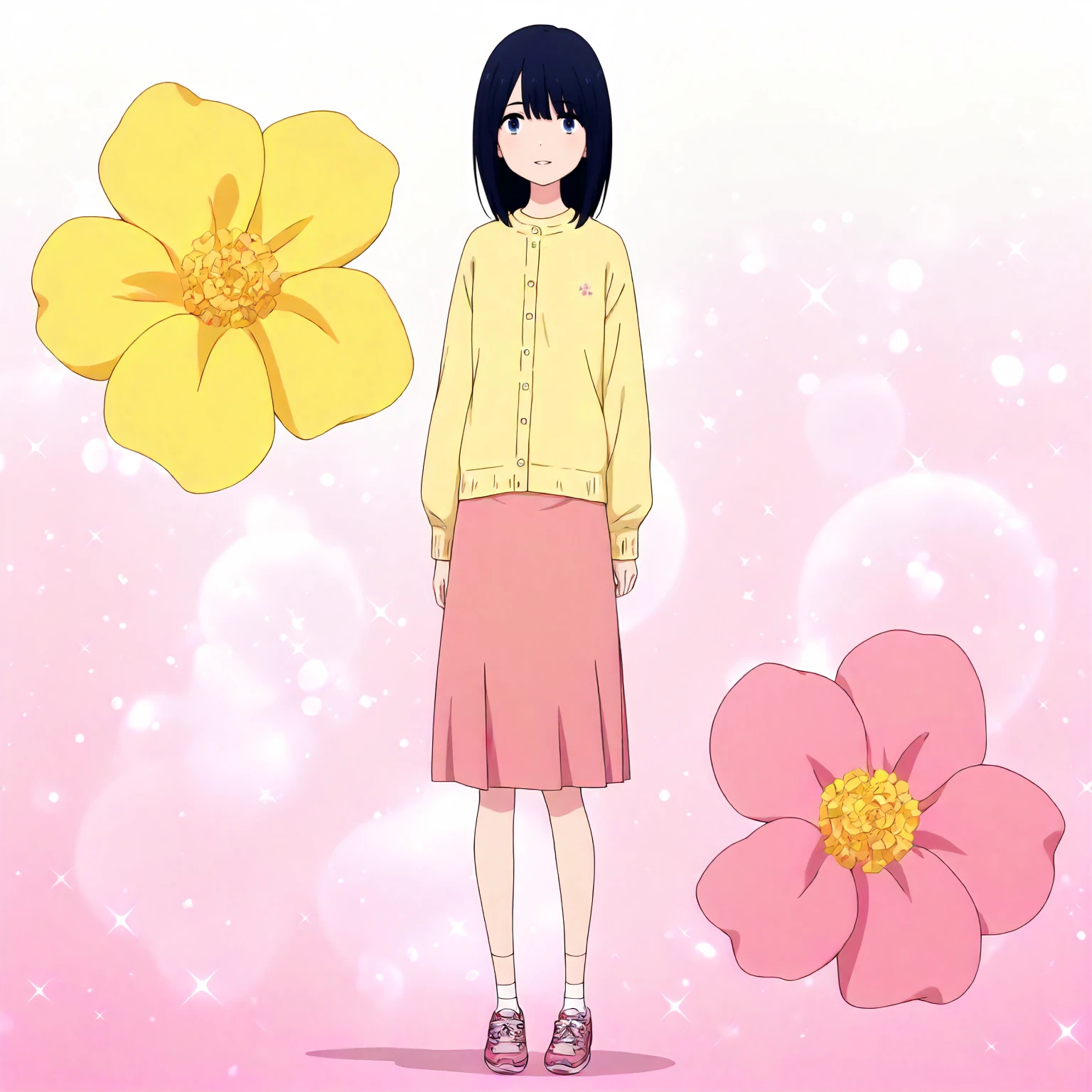 yellow shirt,cream cardigan, pink skirt,