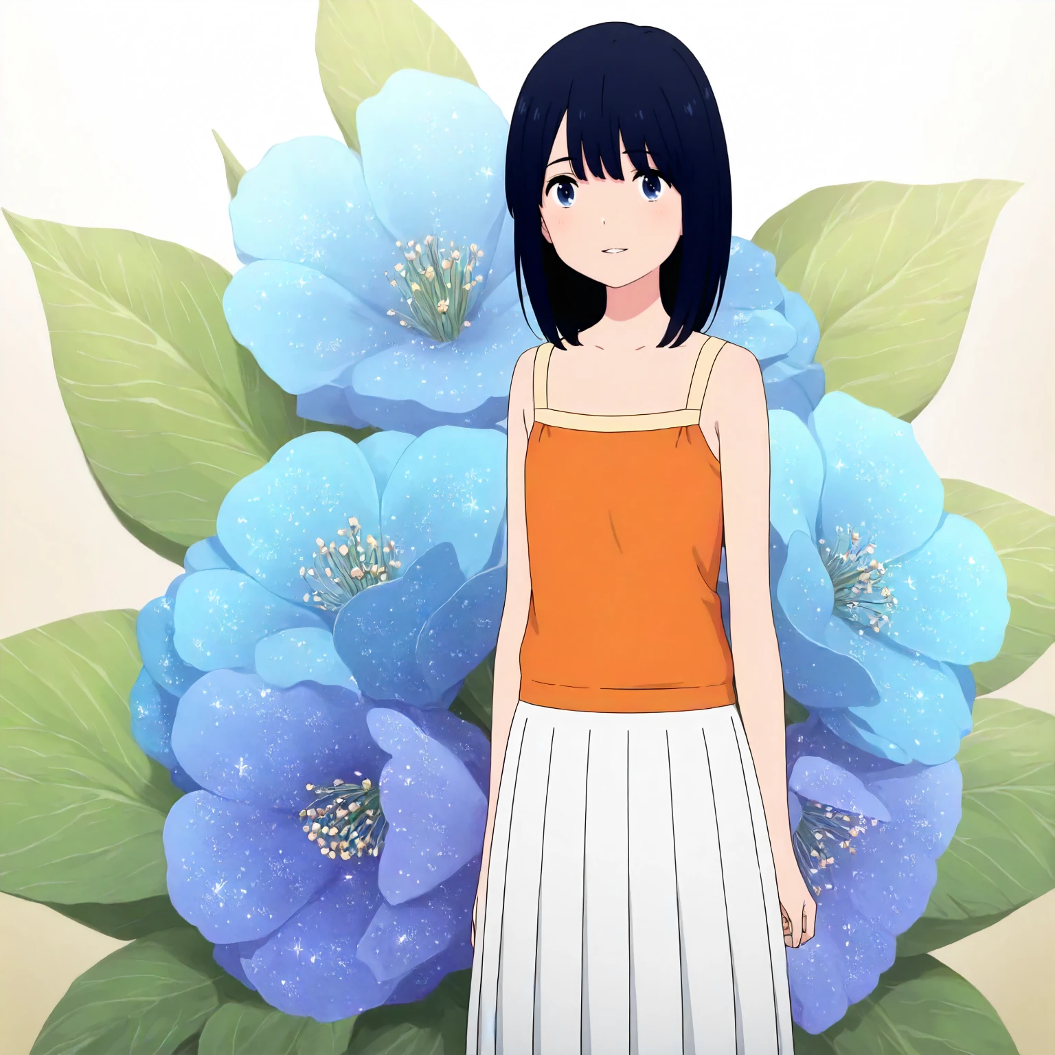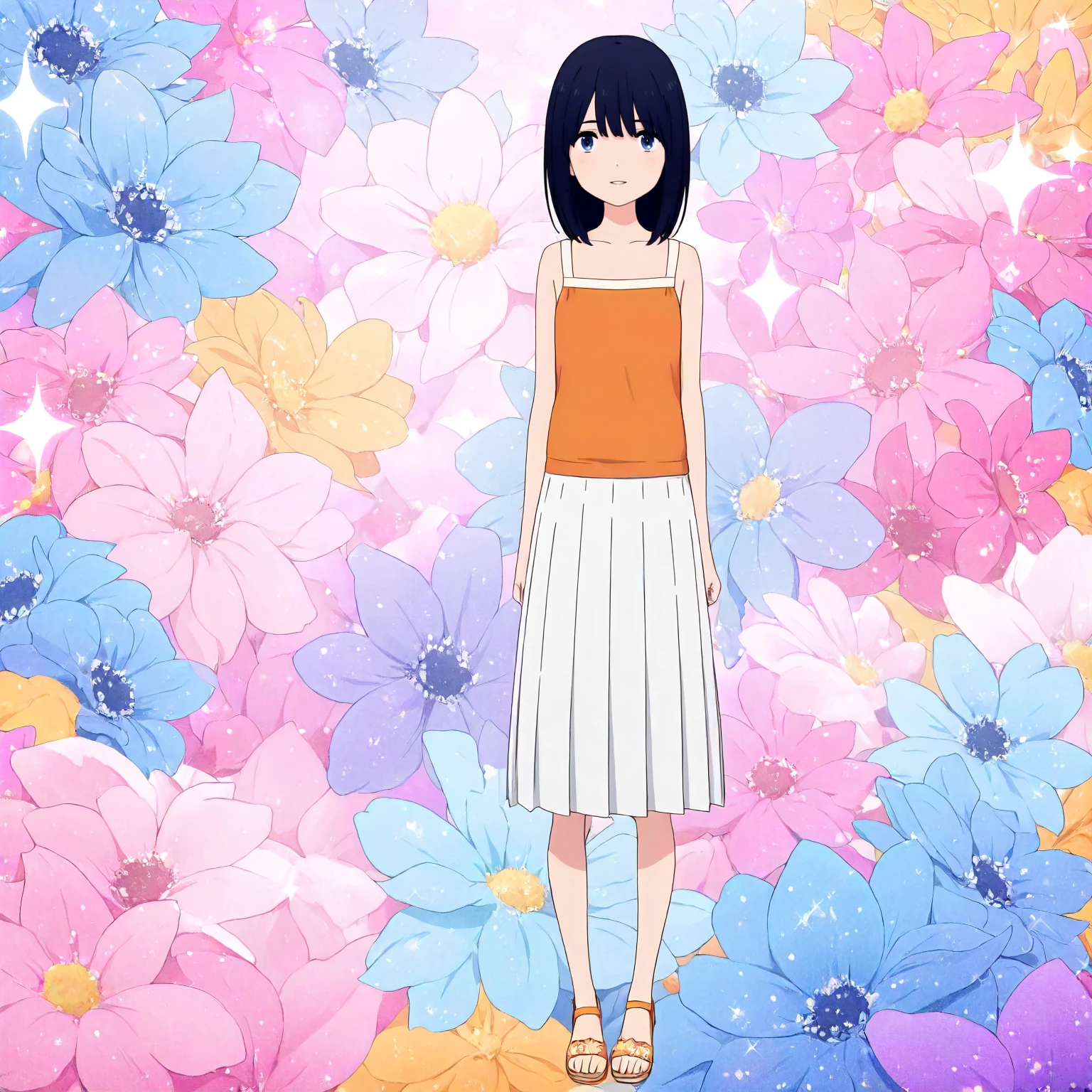 orange camisole,sleeveless, white skirt,pleated_skirt,