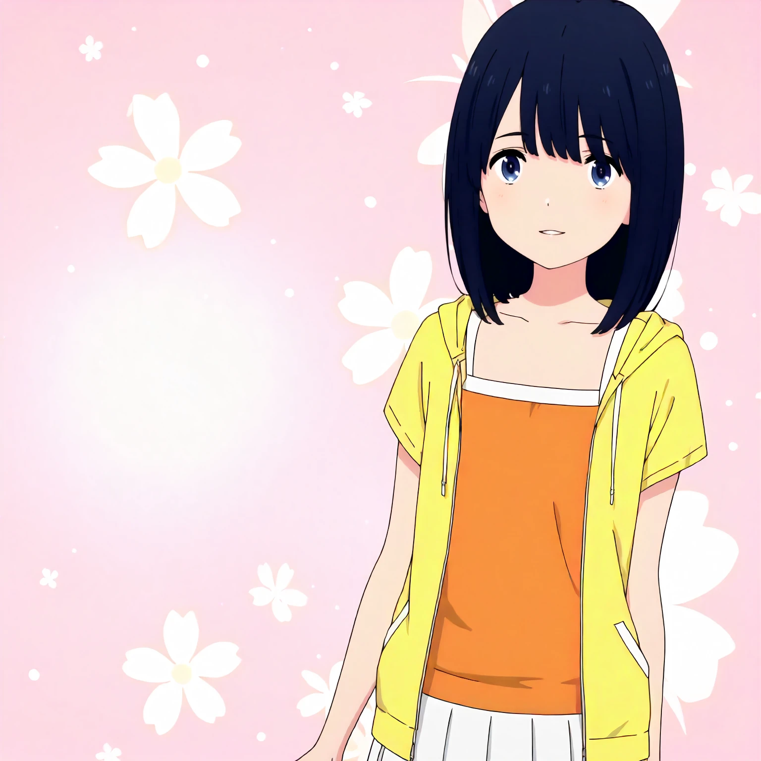 orange camisole,yellow hoodie jacket,short_sleeves, white skirt,pleated_skirt,
