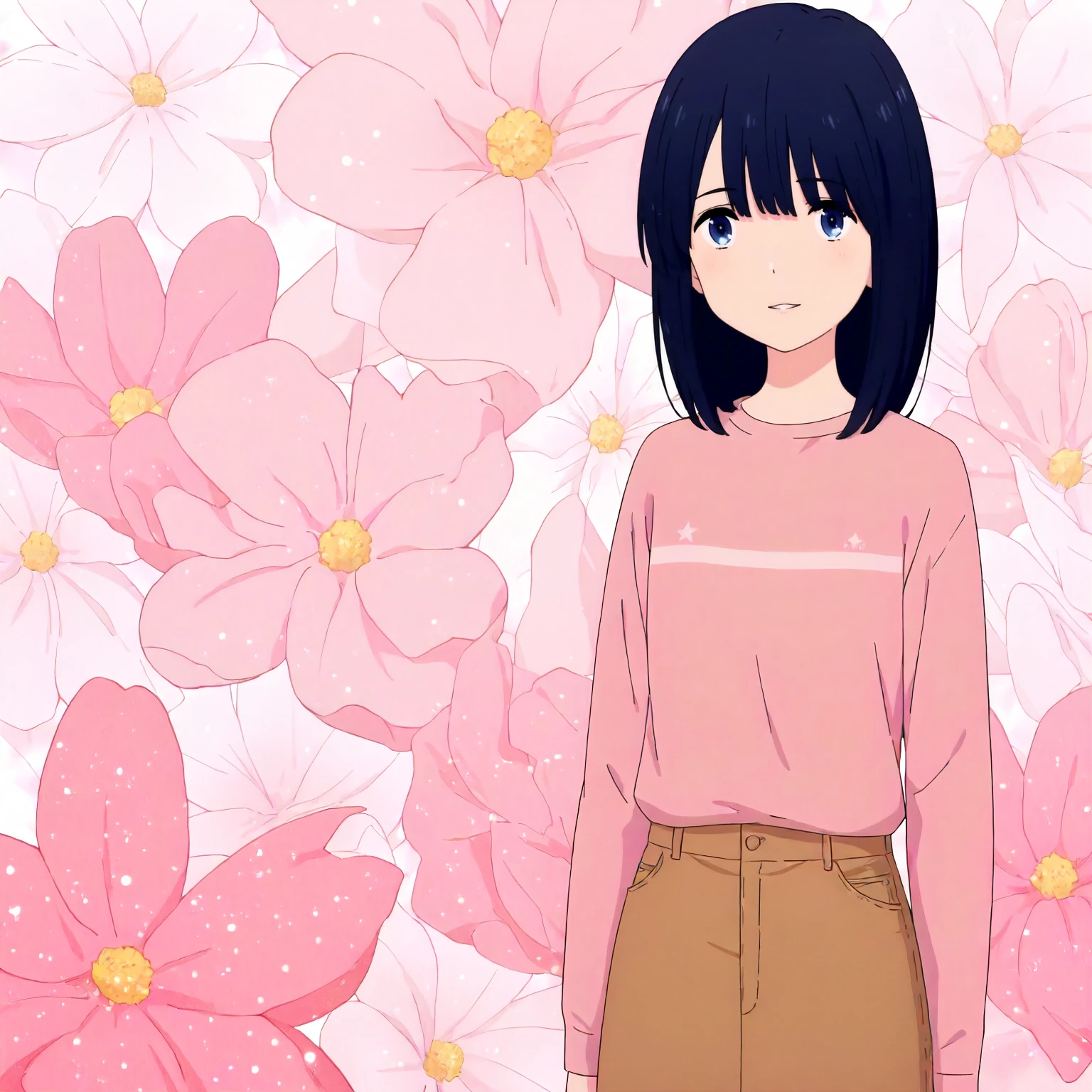 pink shirt,no collar,long_sleeves, brown denim skirt,