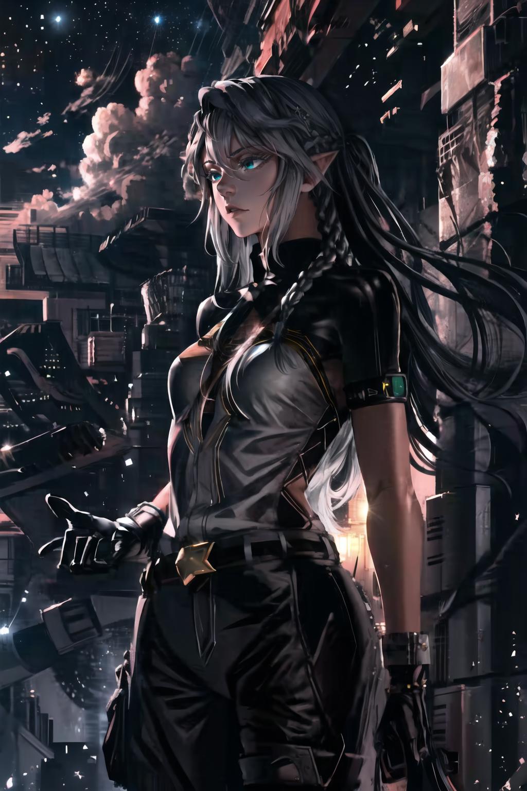 For Armored outfit can help adding "black bodysuit, armor, single shoulder pad, breast plate, arm guards, hip armor" but is not needed much.