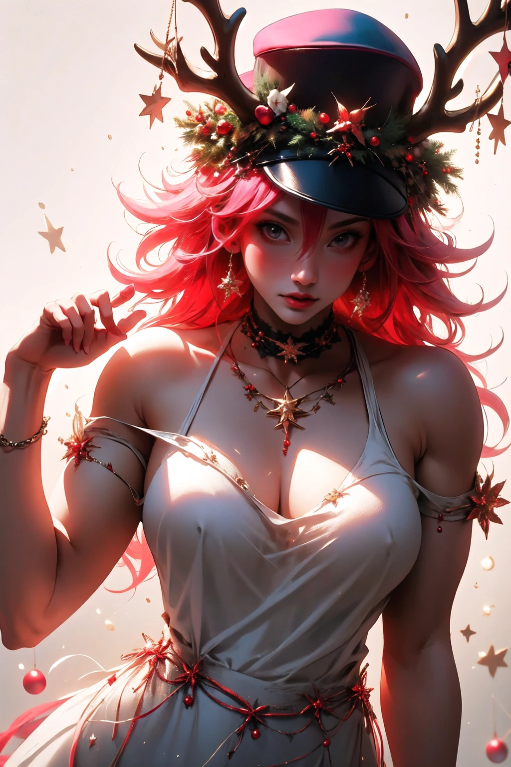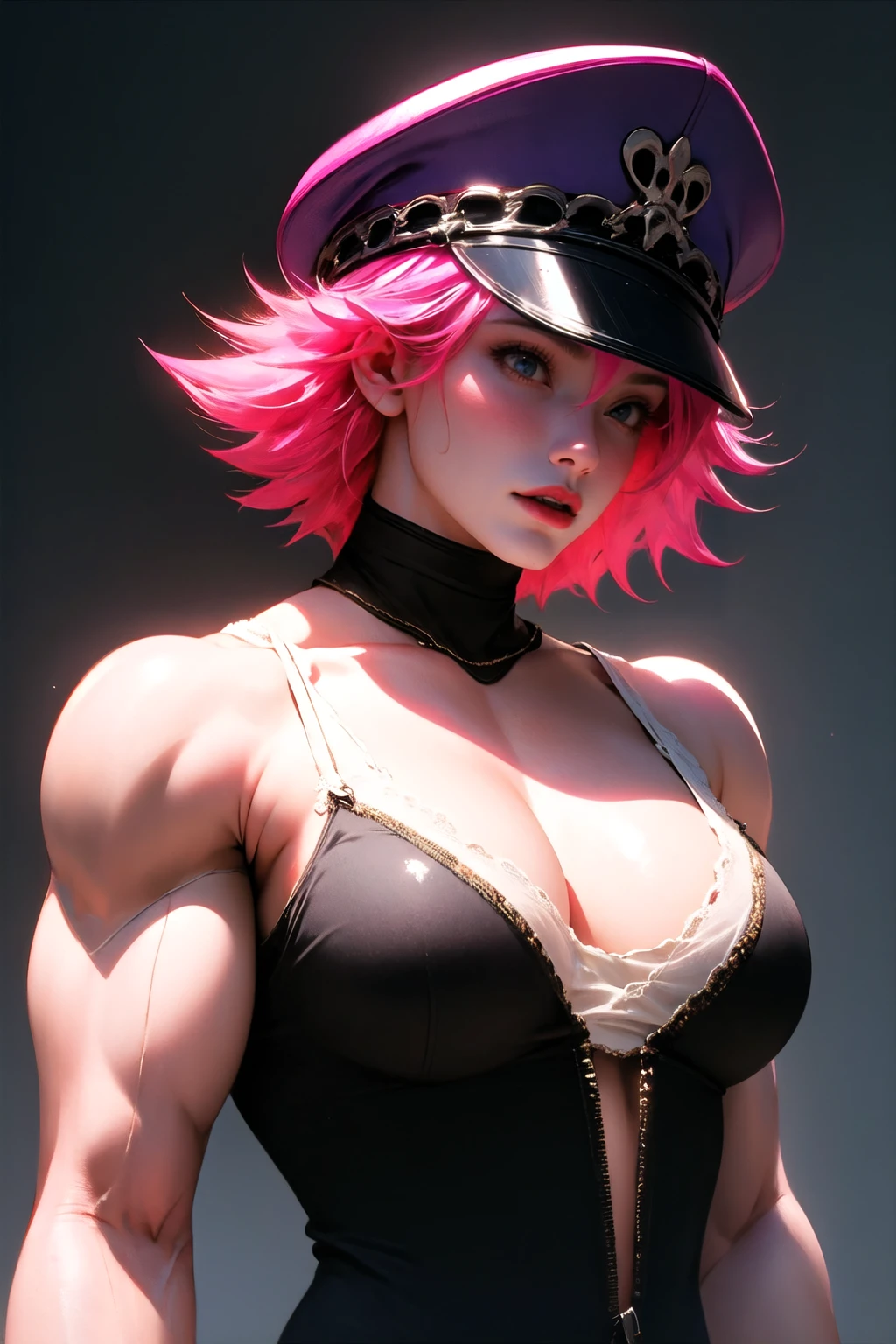 blue eyes,large breasts,muscular female, pink cap