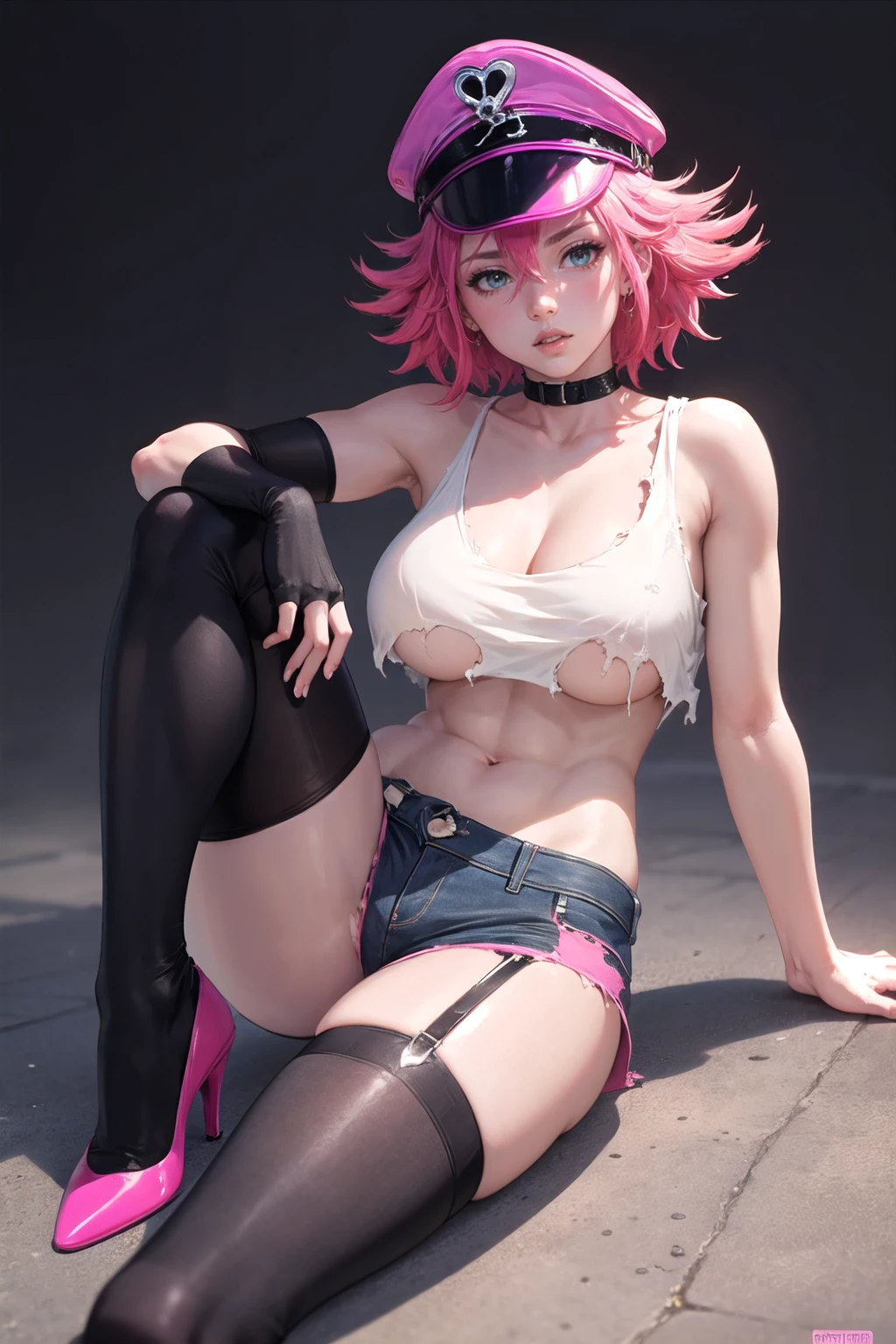 Default Dress: peaked cap, single thighhigh, high heels, crop top, denim shorts, torn clothes, single elbow glove