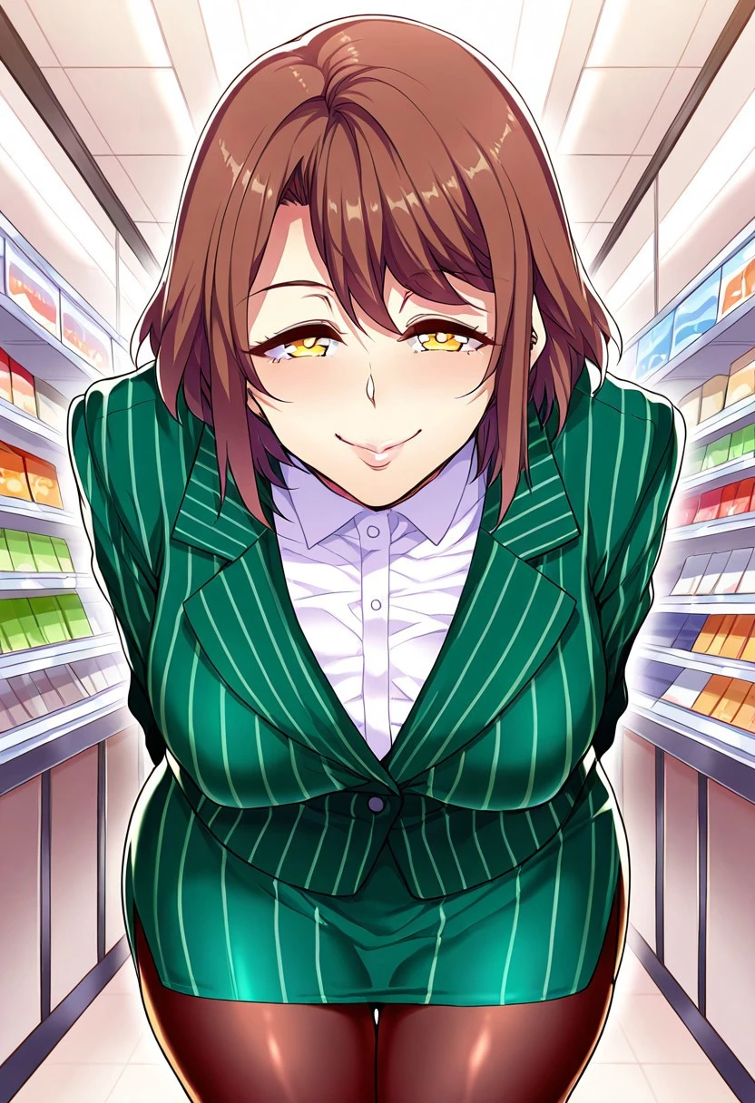 Souma Souko: souma_souko, piercing yellow eyes, beautiful brown hair, medium bob haircut, bangs, huge and shaggy breast,