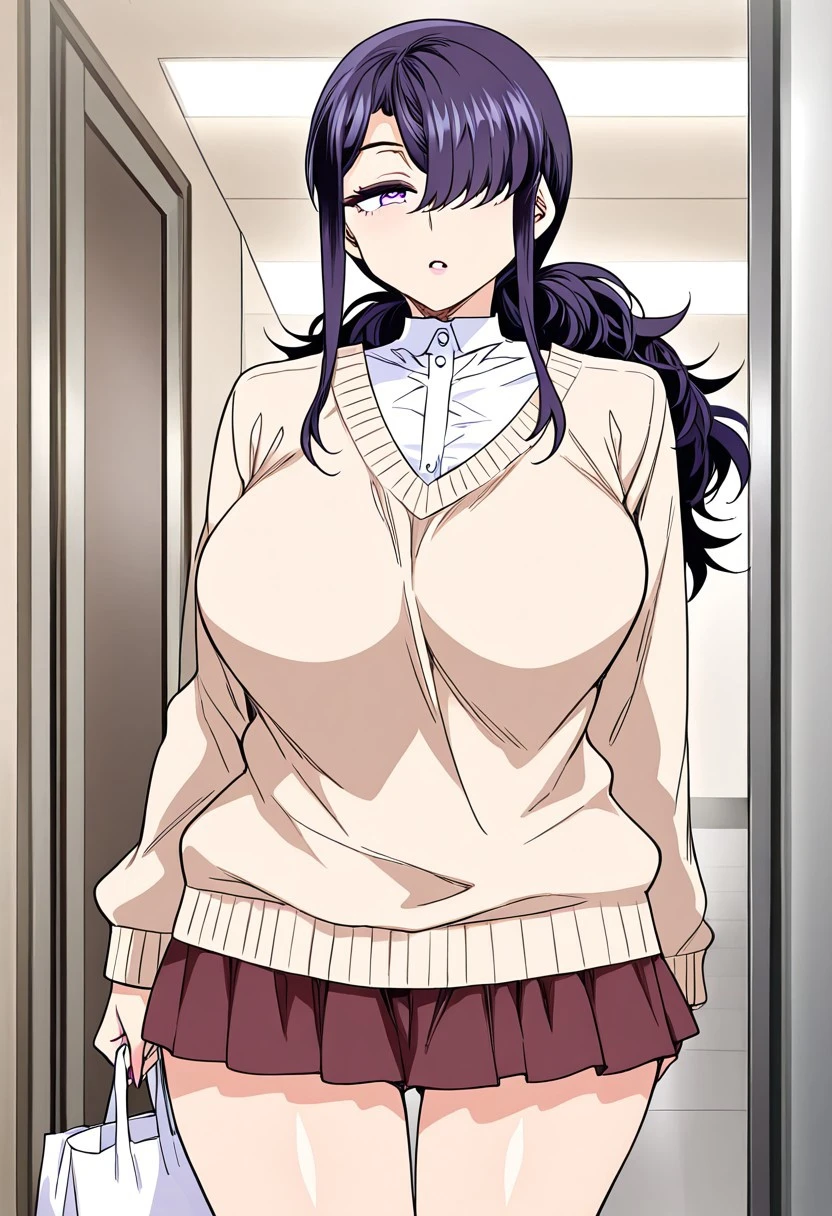 Rena Nagisa: rena_nagisa, beautiful purple eyes, beautiful purple hair, bangs, messy low long ponytail, hair over one eyes, really huge and shaggy breast, really wide hips, sexy milf,