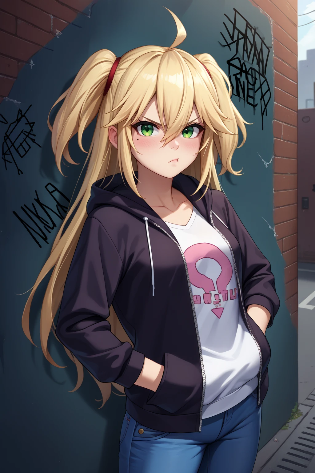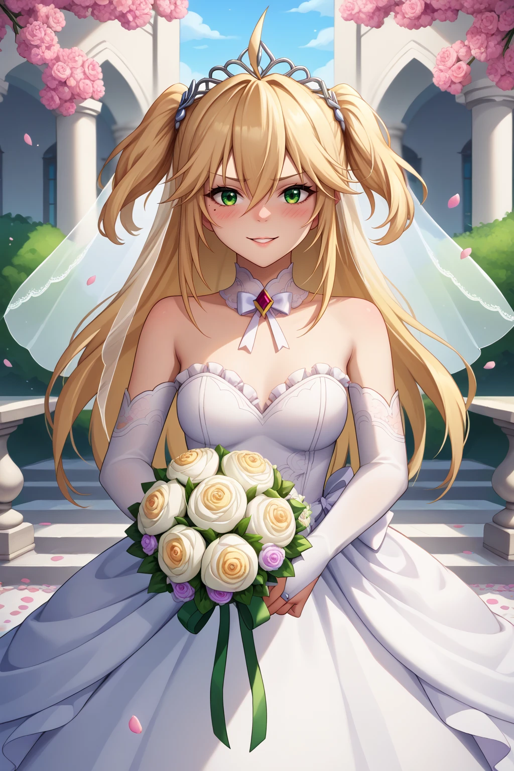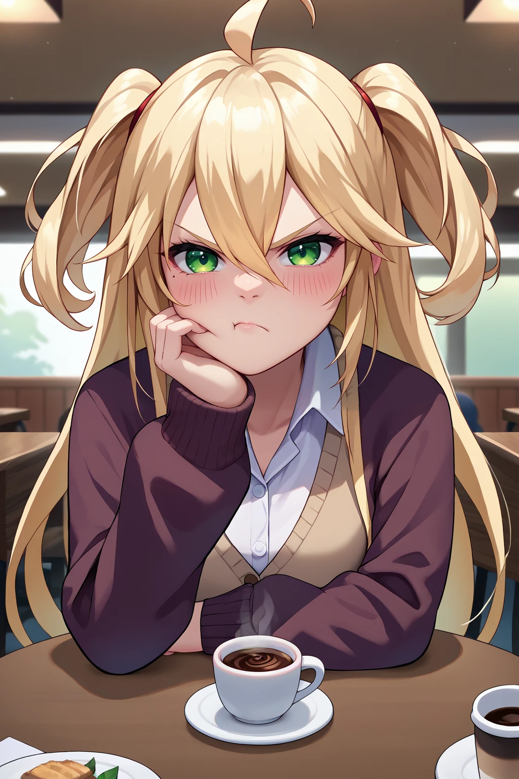 Appearance : adhp, mole under eye, blonde hair, long hair, ahoge, hair between eyes, green eyes, two side up