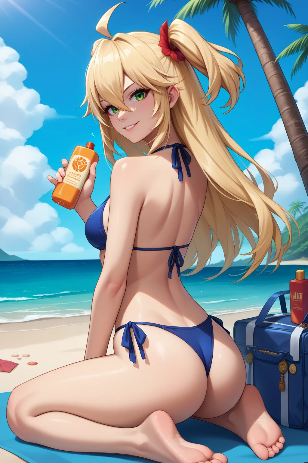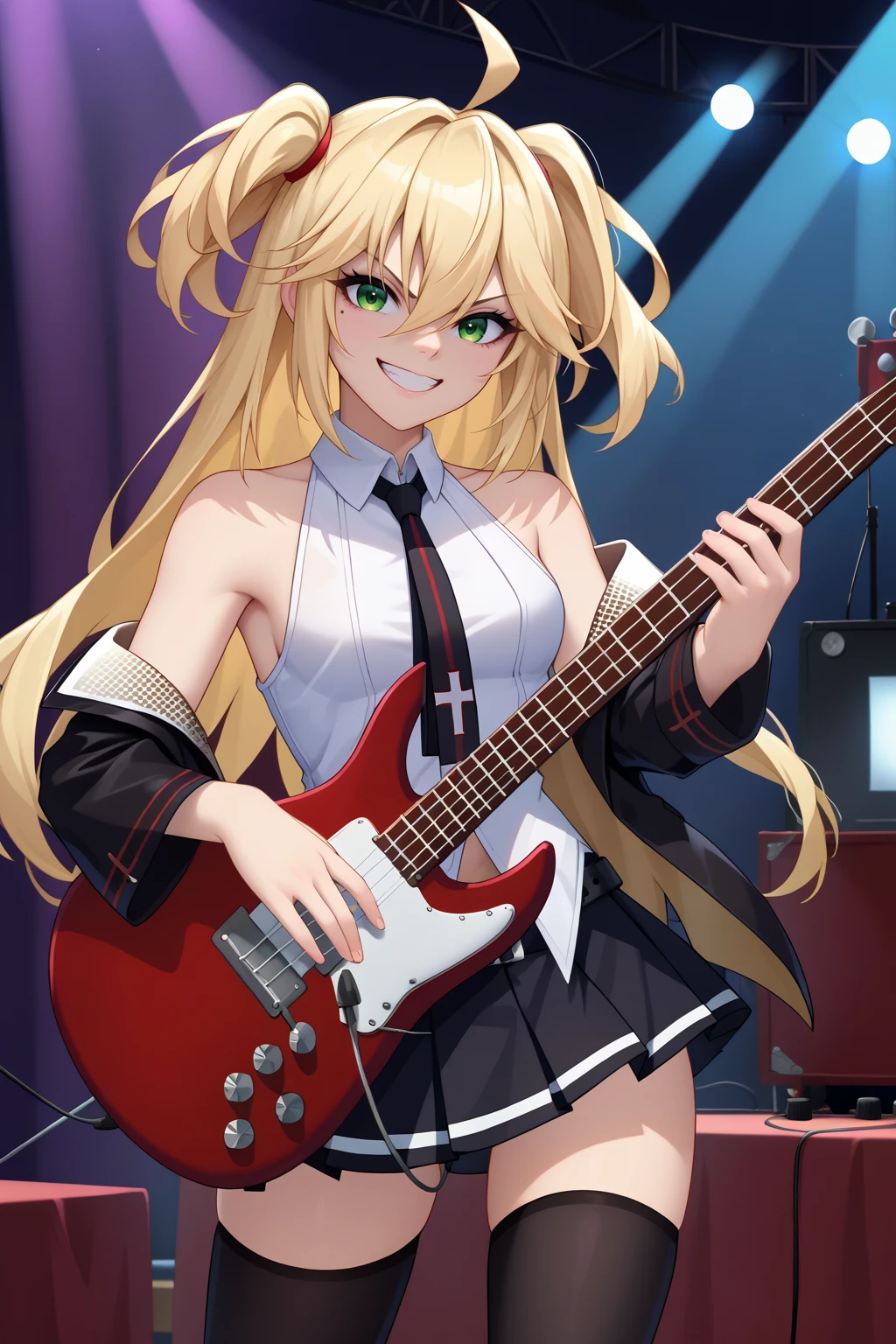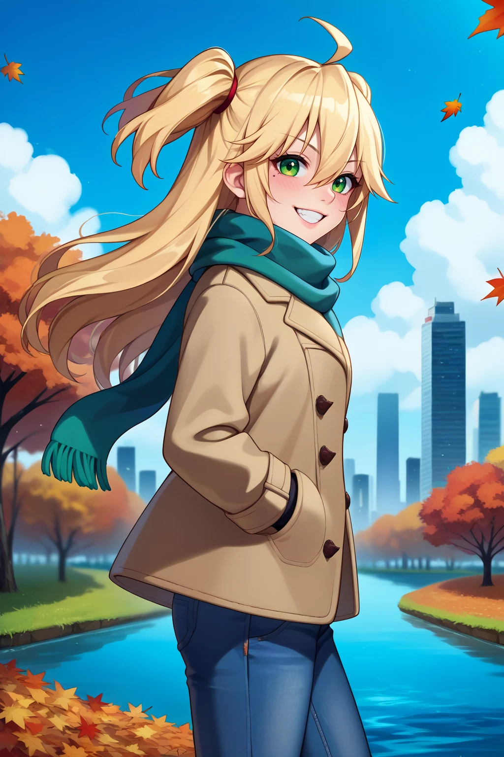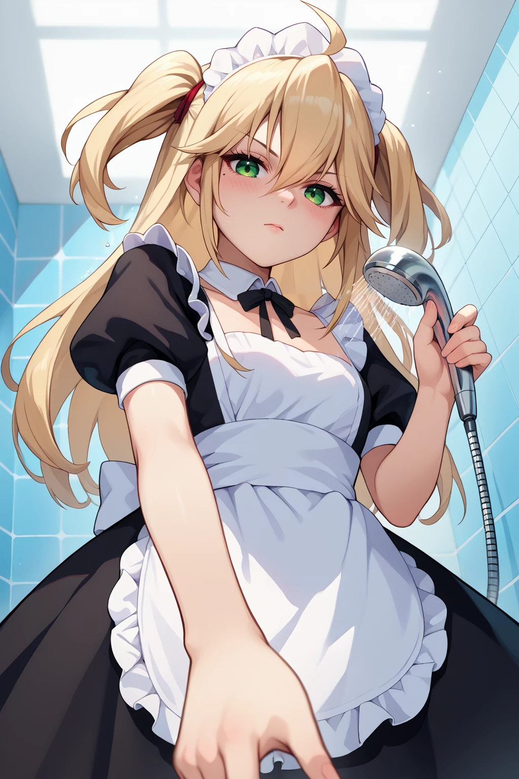 Appearance : adhp, mole under eye, blonde hair, long hair, ahoge, hair between eyes, green eyes, two side up