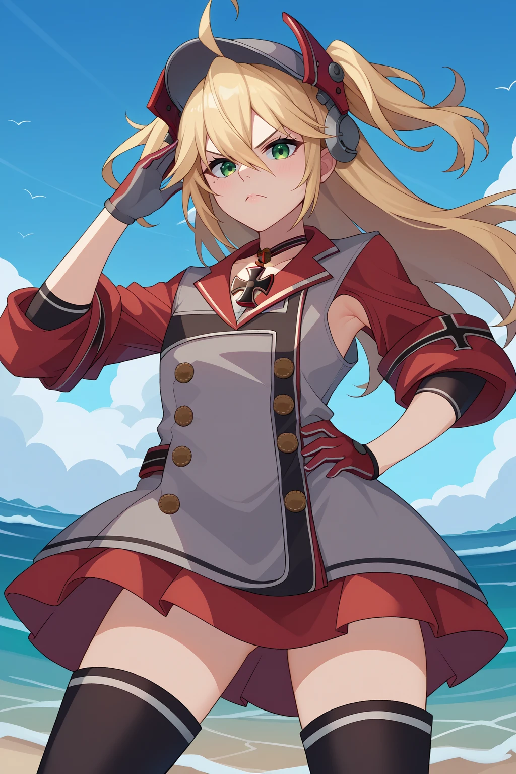 Outfit 1 : visor cap, headgear, cross choker, iron cross, multicolored dress, collared dress, grey dress, red dress, black dress, double-breasted, buttons, armpit cutout, sleeves rolled up, two-tone gloves, red gloves, grey gloves, black thighhighs, knee boots