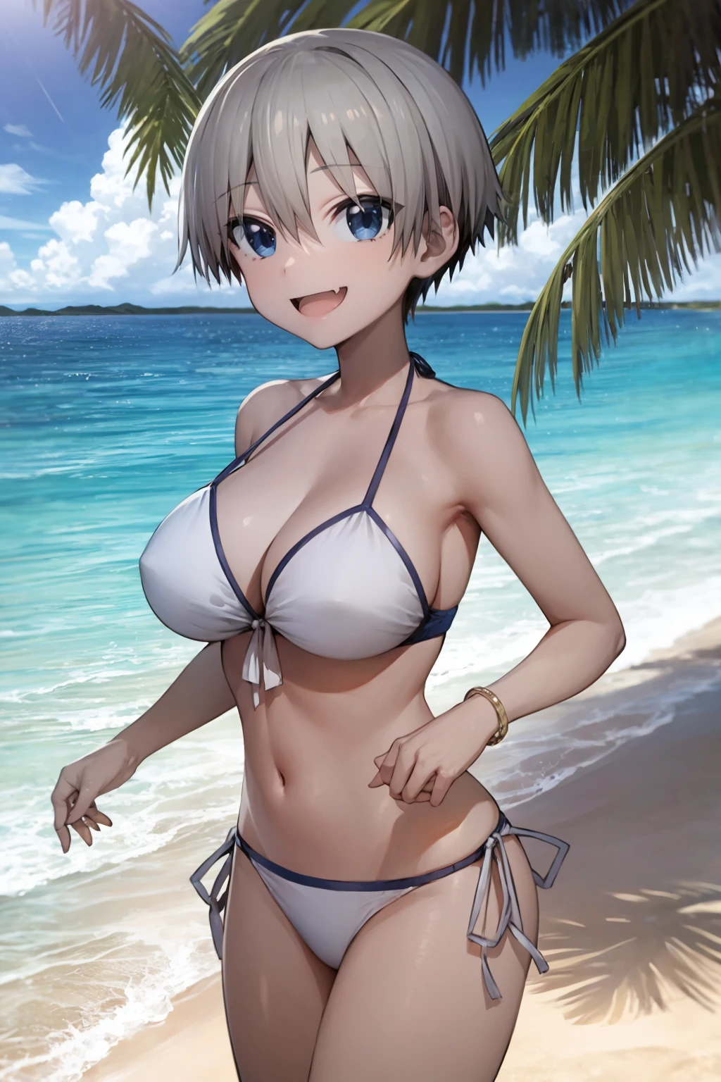 Basic prompts : 1girl, grey hair, short hair, hair between eyes, bangs, blue eyes, skin fang
