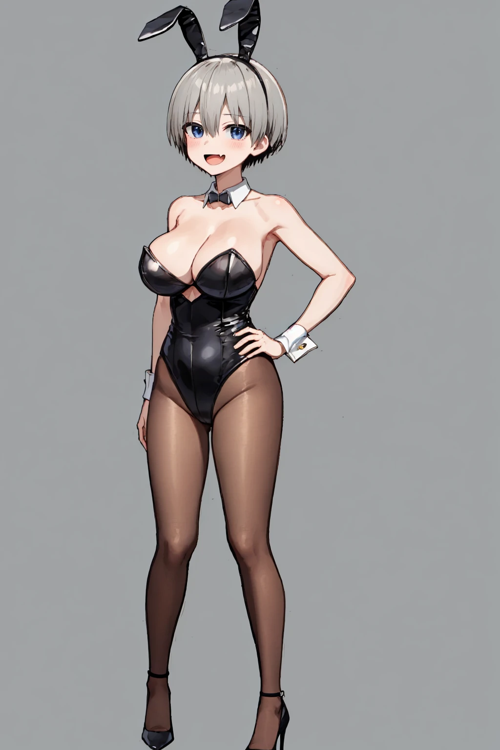Playboy bunny prompts : fake rabbit ears, bangs, bare shoulders, black leotard, red bowtie, large breasts, brown pantyhose, cleavage, collarbone, detached collar, leotard, playboy bunny, rabbit tail, wrist cuffs, high heels