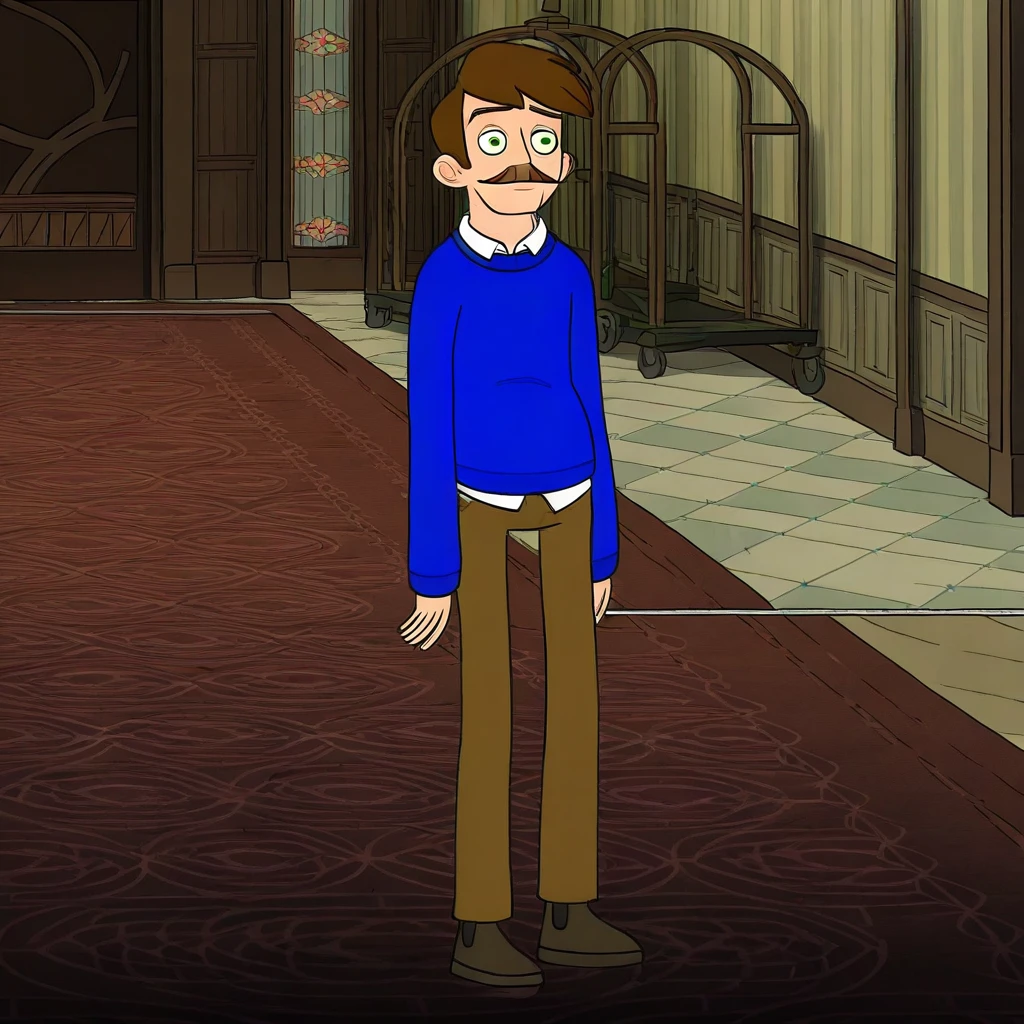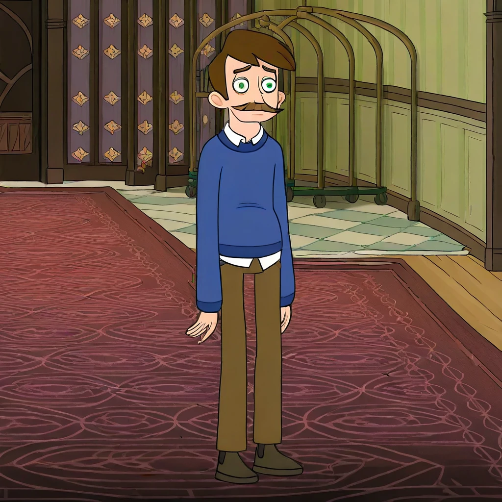 NathanFreeling, 1boy, solo, adult male, Nathan Hair Style, brown hair, fair skin, green eyes, mustache, thin tall body, blue sweater over white shirt, brown pants, dark shoes,