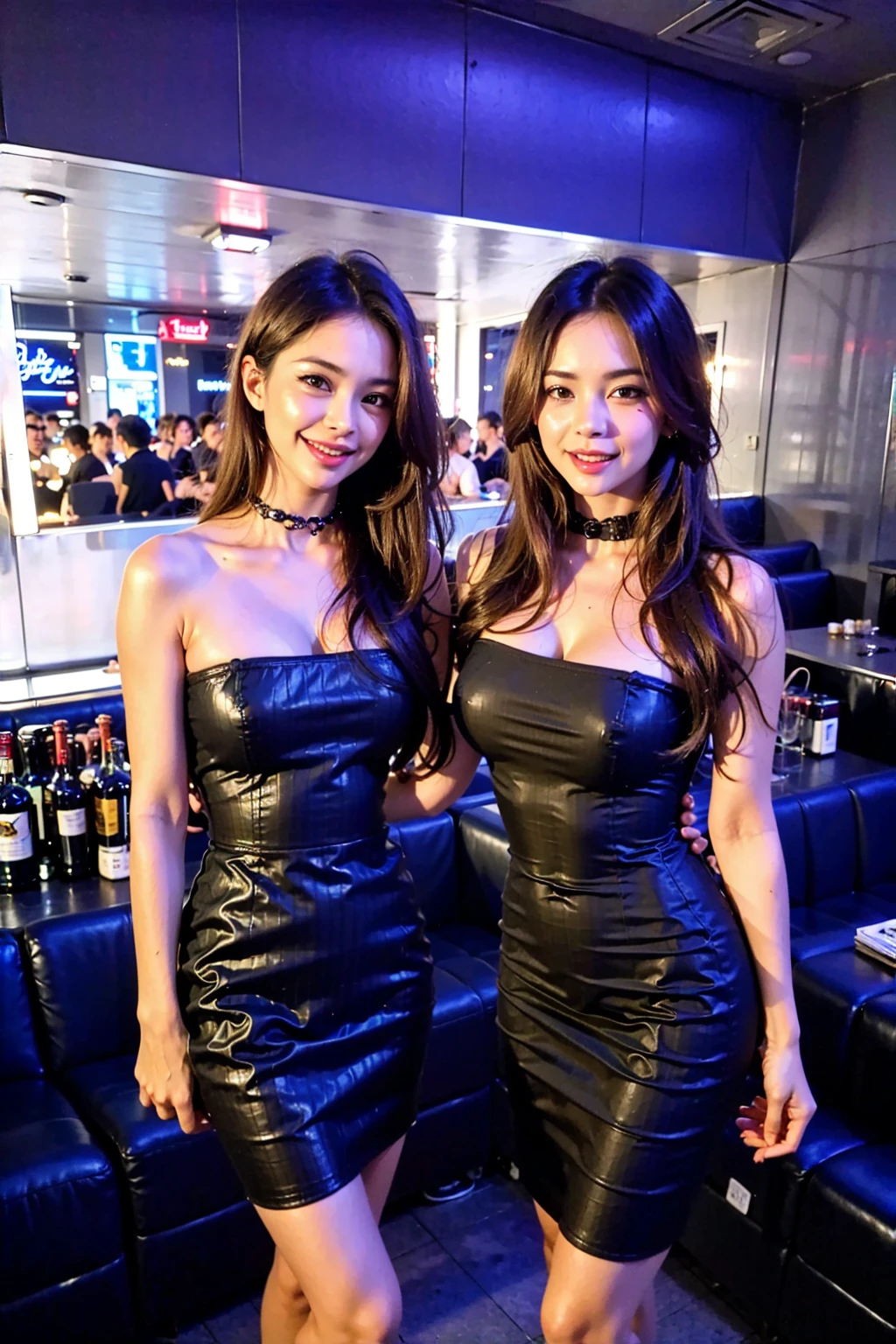 어두운 환경에서 한 명 이상의 여성을 생성하는 데 적합한 나이트 클럽 환경 로라이며, 바는 다양한 색상의 조명으로 가득합니다. 그런 분위기에서 여성들이 특이한 일을 할 수 있지 않습니까?