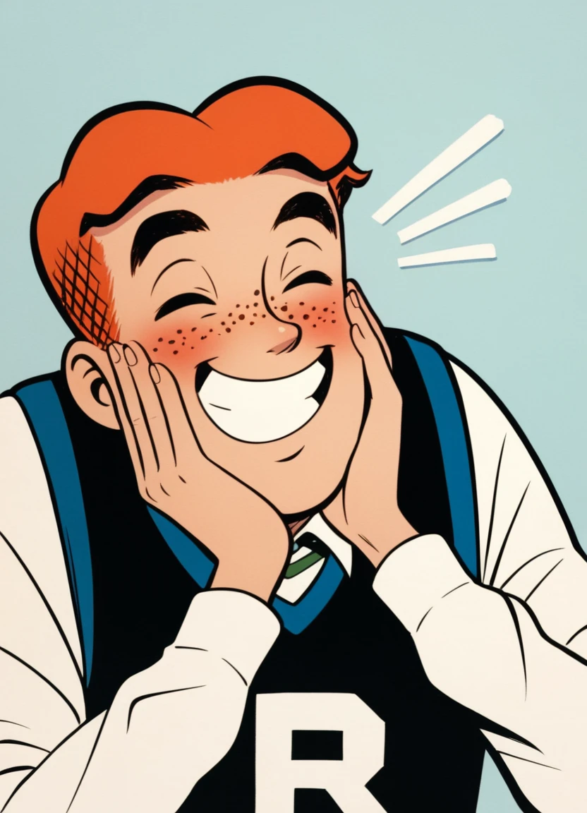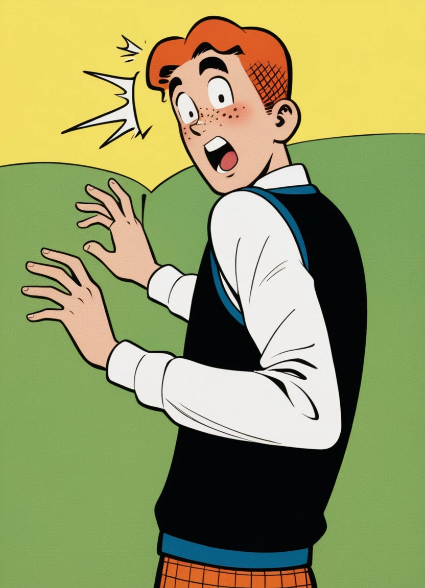 archie andrews, orange hair, short hair, freckles, black sweater vest, "R", long sleeves, white sleeves, green bowtie, polka dot