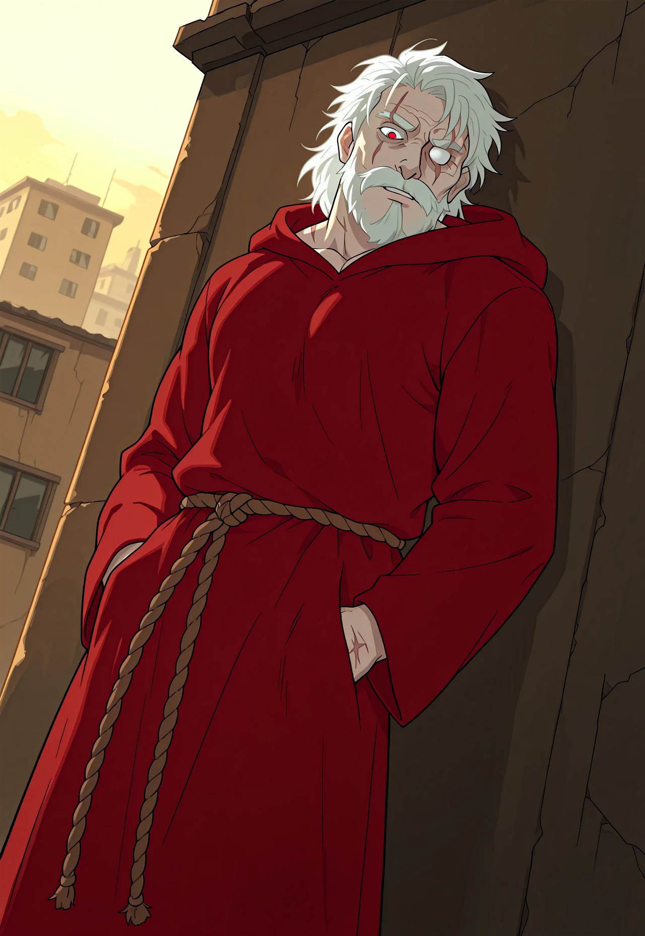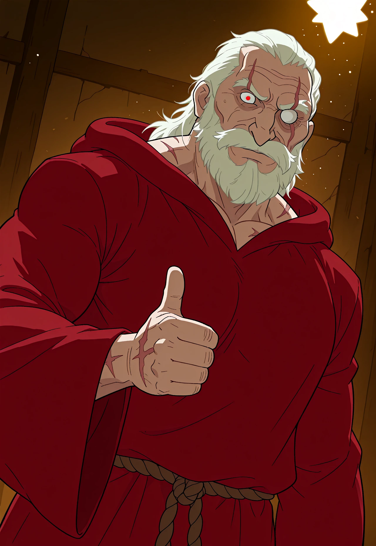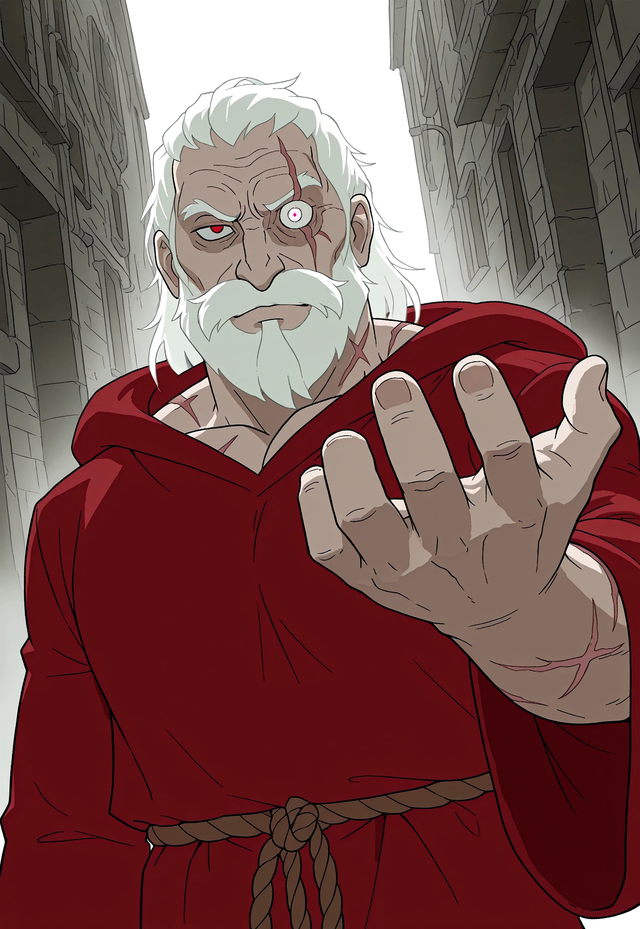old_man_cultist,a scar across left eye , white-colored hair and beard, white mustache, (Red color eyes)