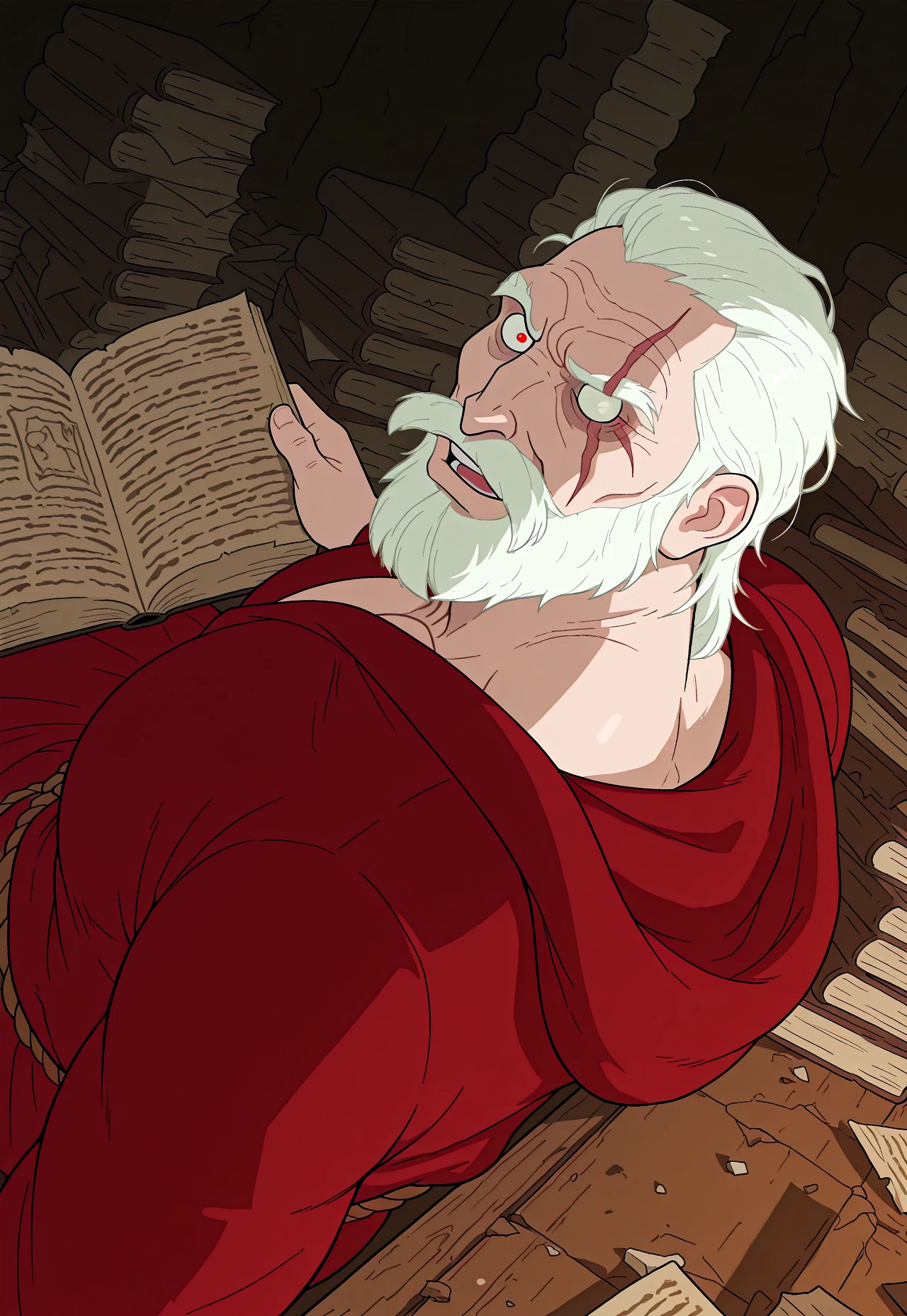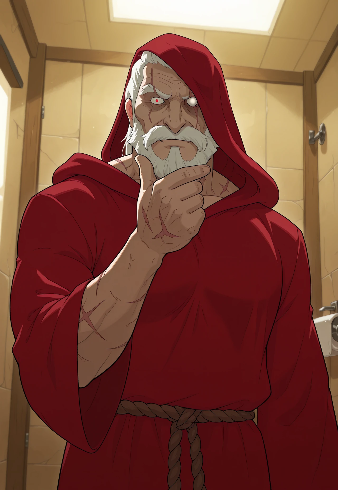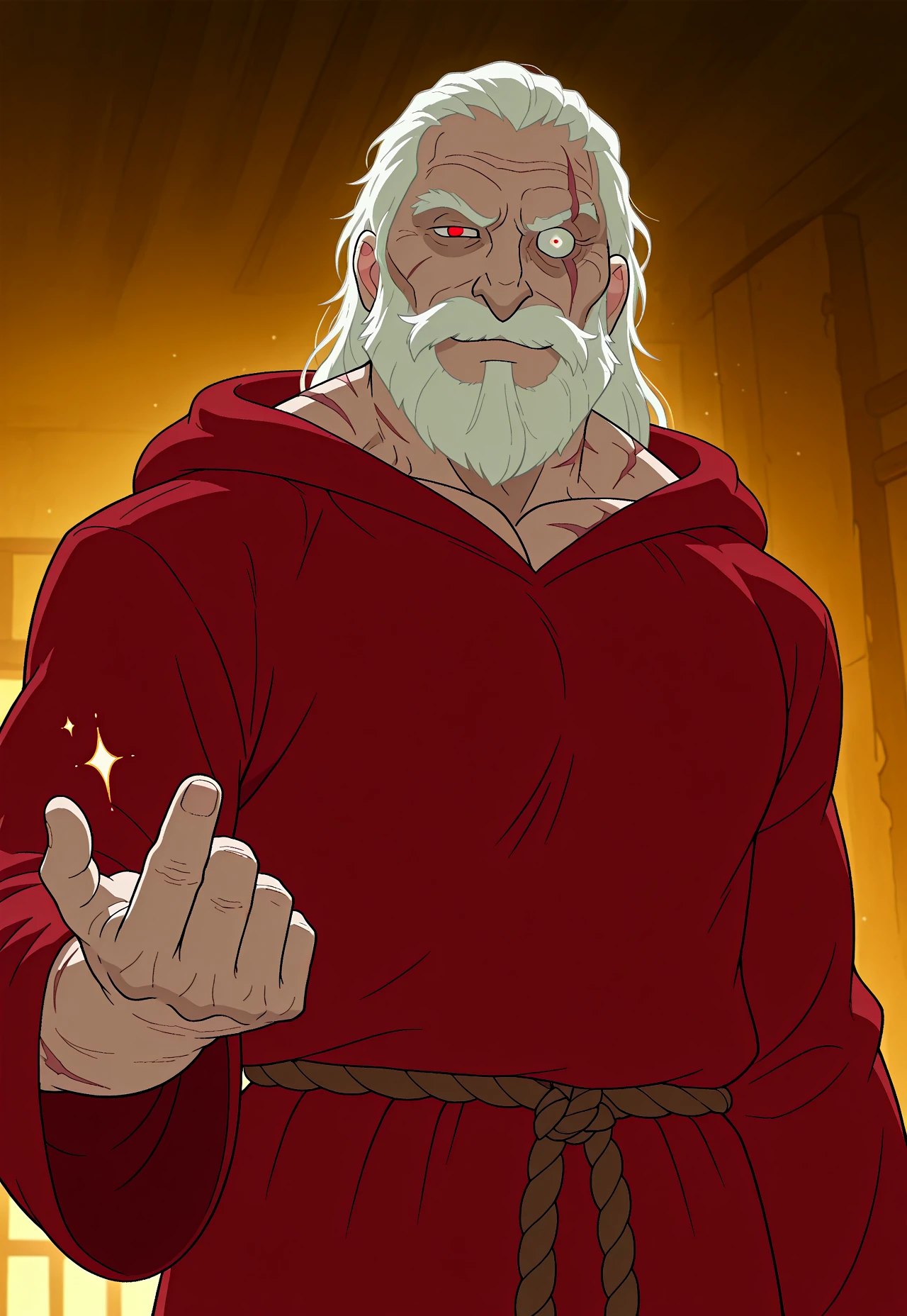 old_man_cultist,a scar across left eye , white-colored hair and beard, white mustache, (Red color eyes)