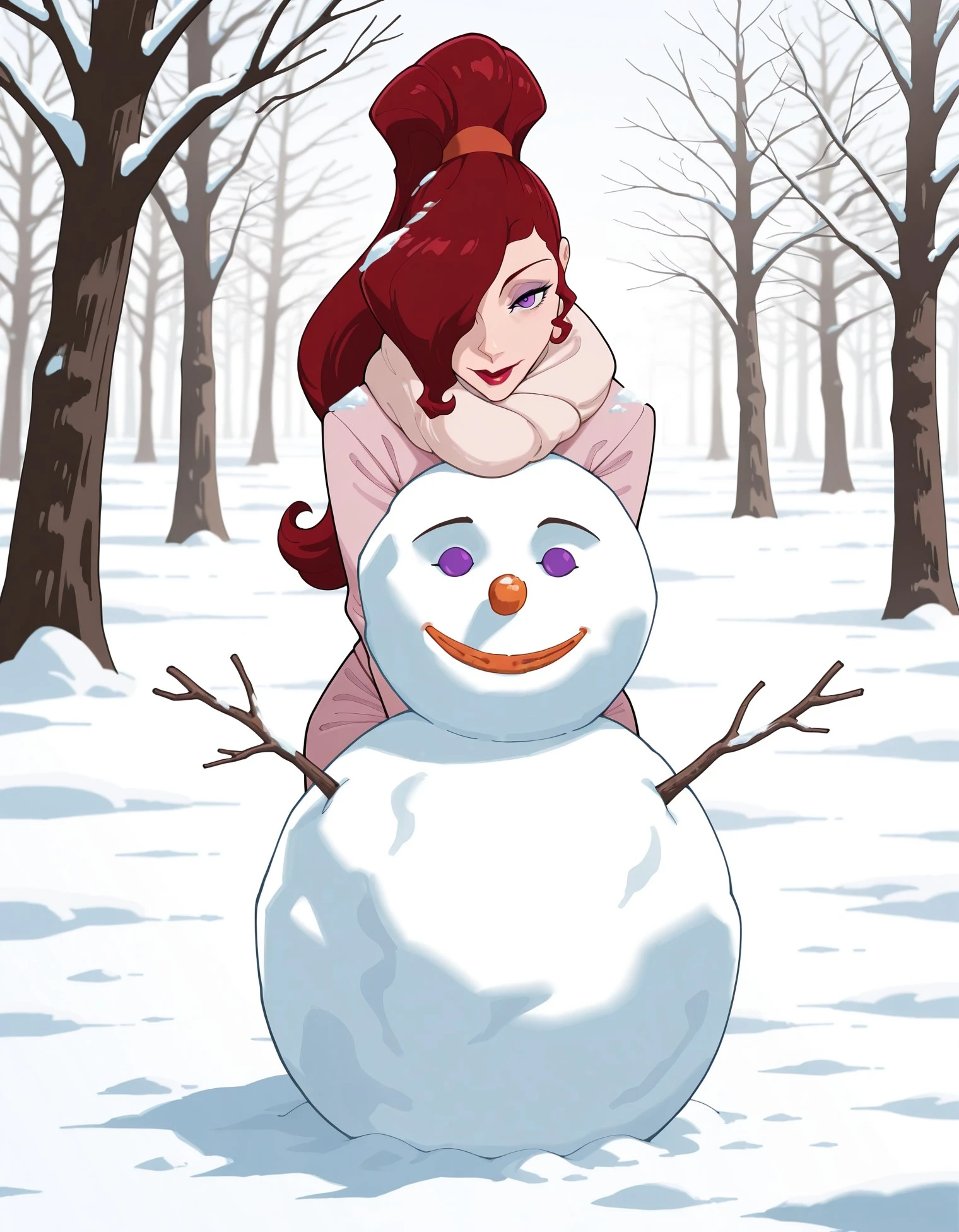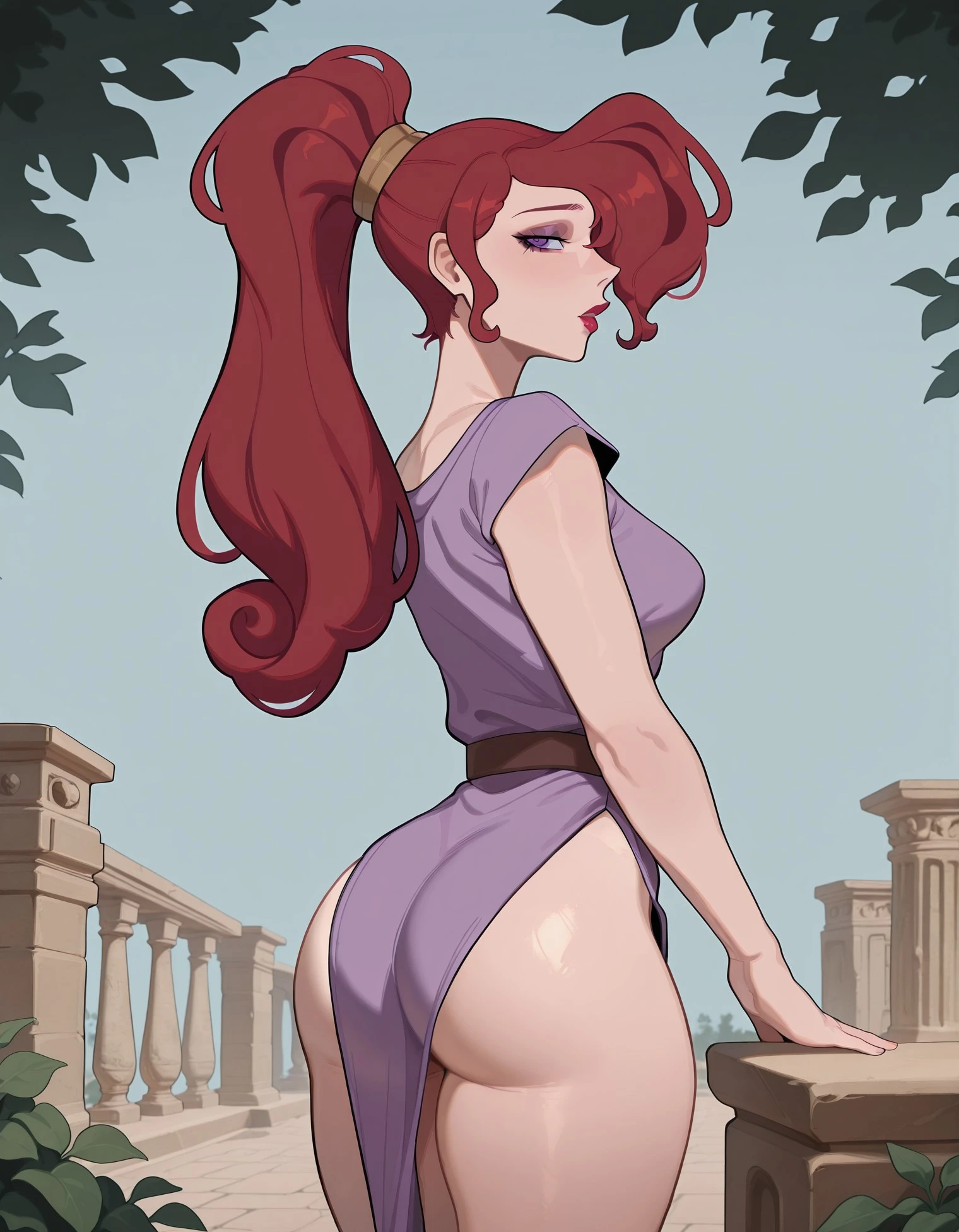 Me3ar1, long hair, purple eyes, red hair, hair over one eye, makeup, lipstick, ponytail