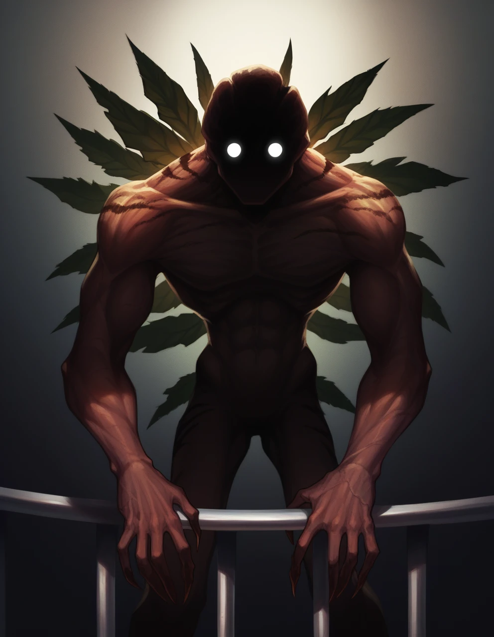 brack3n, monster, no mouth, shaded face, skinny, muscular, veins, leaf, white eyes, glowing eyes, sharp fingernails,