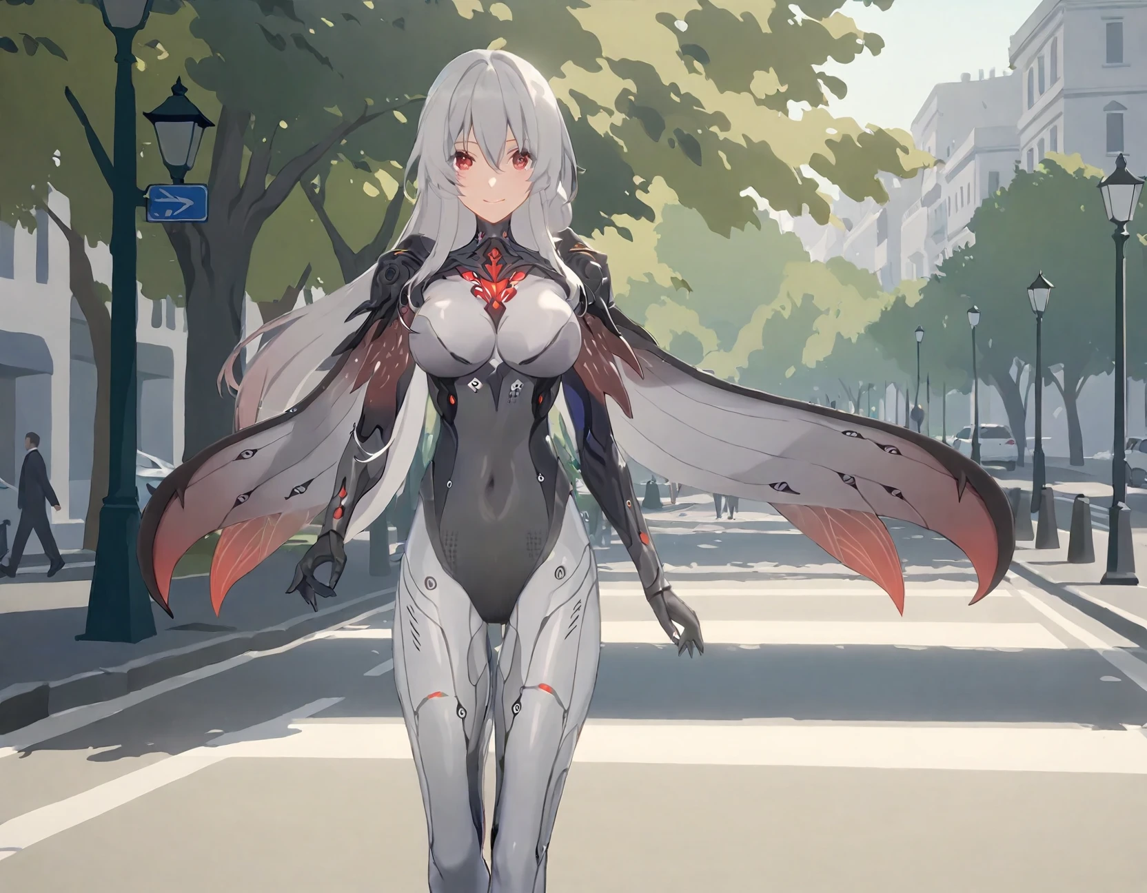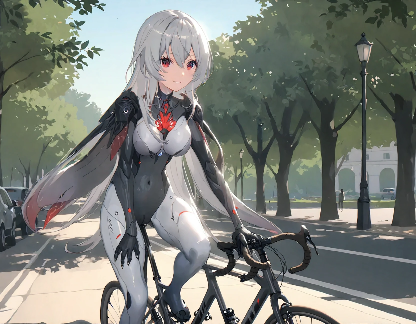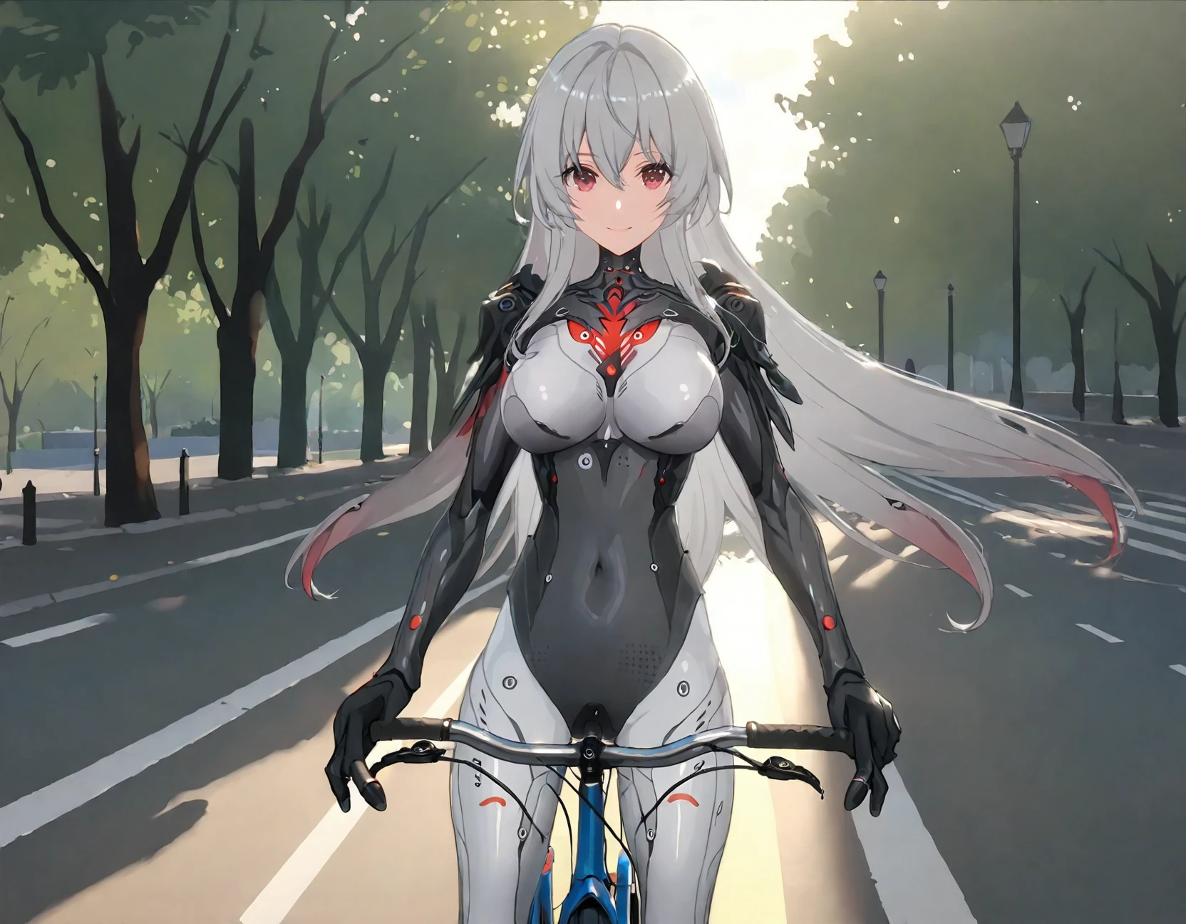 red eyes,breasts,long grey hair,bodysuit