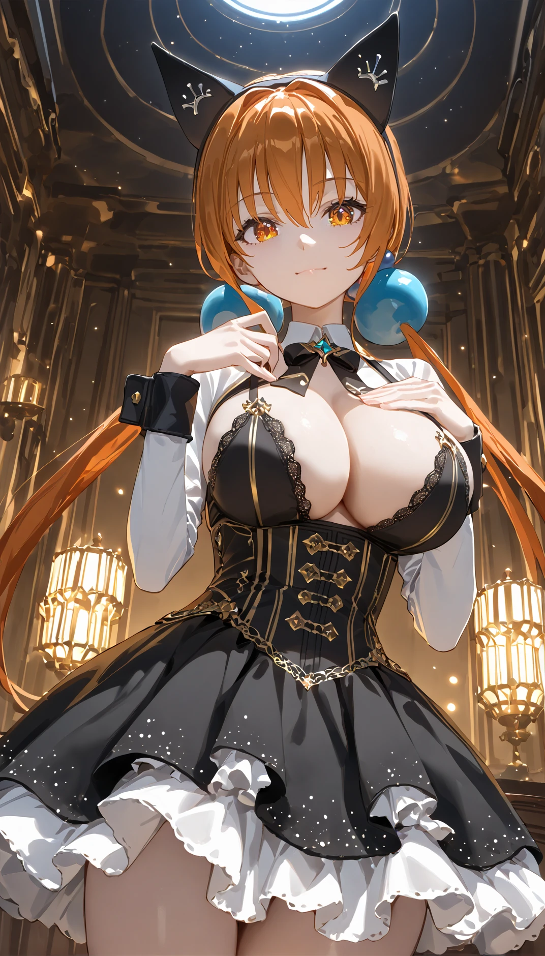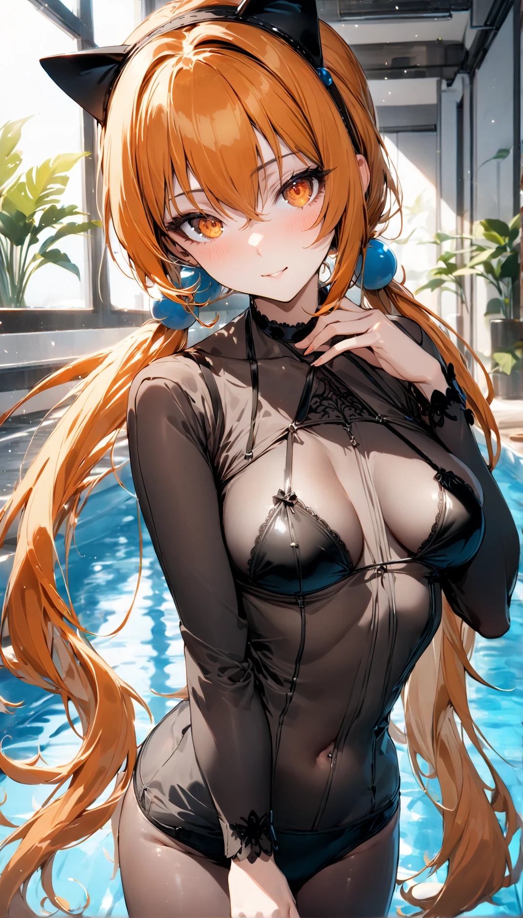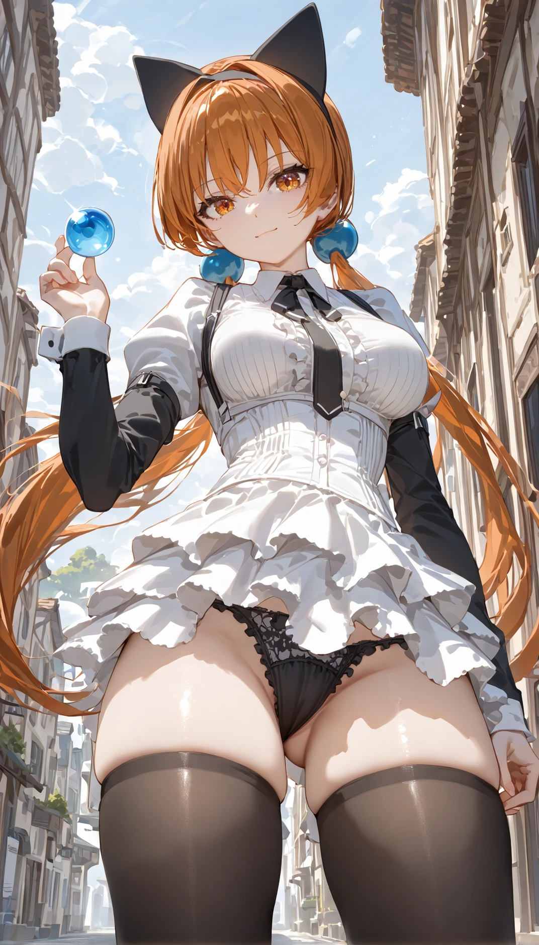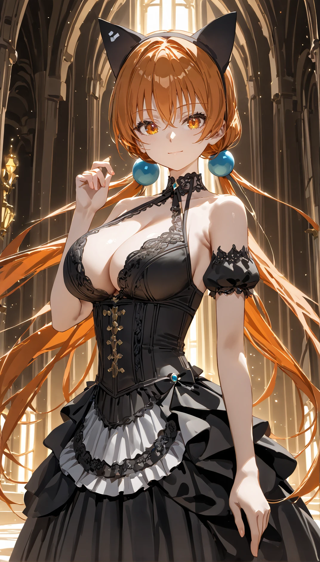 alisa southerncross, orange hair, low twintails, long hair, hair bobbles, cat ears hairband, black hairband