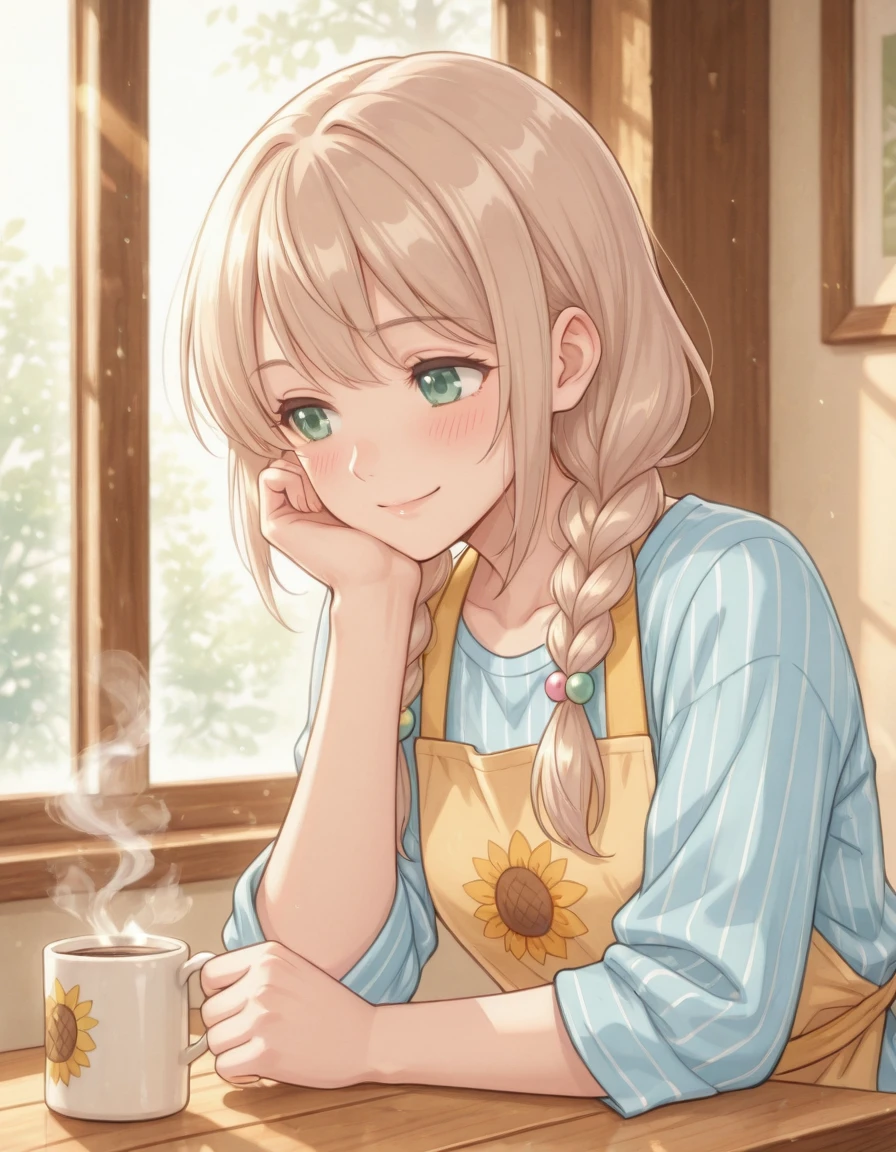 ash blonde hair,long hair,braided pigtails,green eyes,yellow apron,sunflower print,blue and white vertical striped shirt.For Watercolor Style: Add
