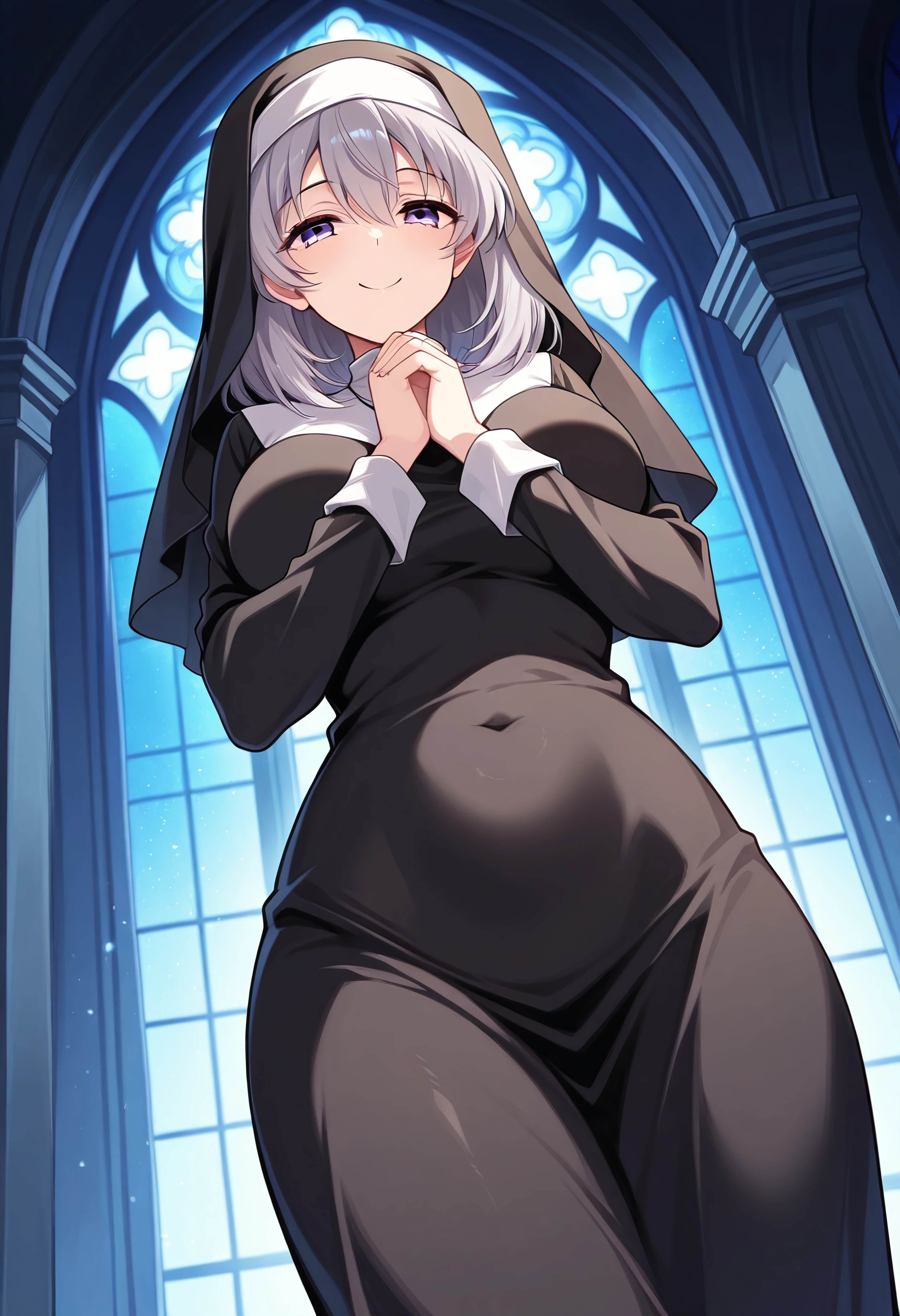 Minato Nami, 1girl, grey hair, violet eyes, nun, habit, black long dress, veil, robe