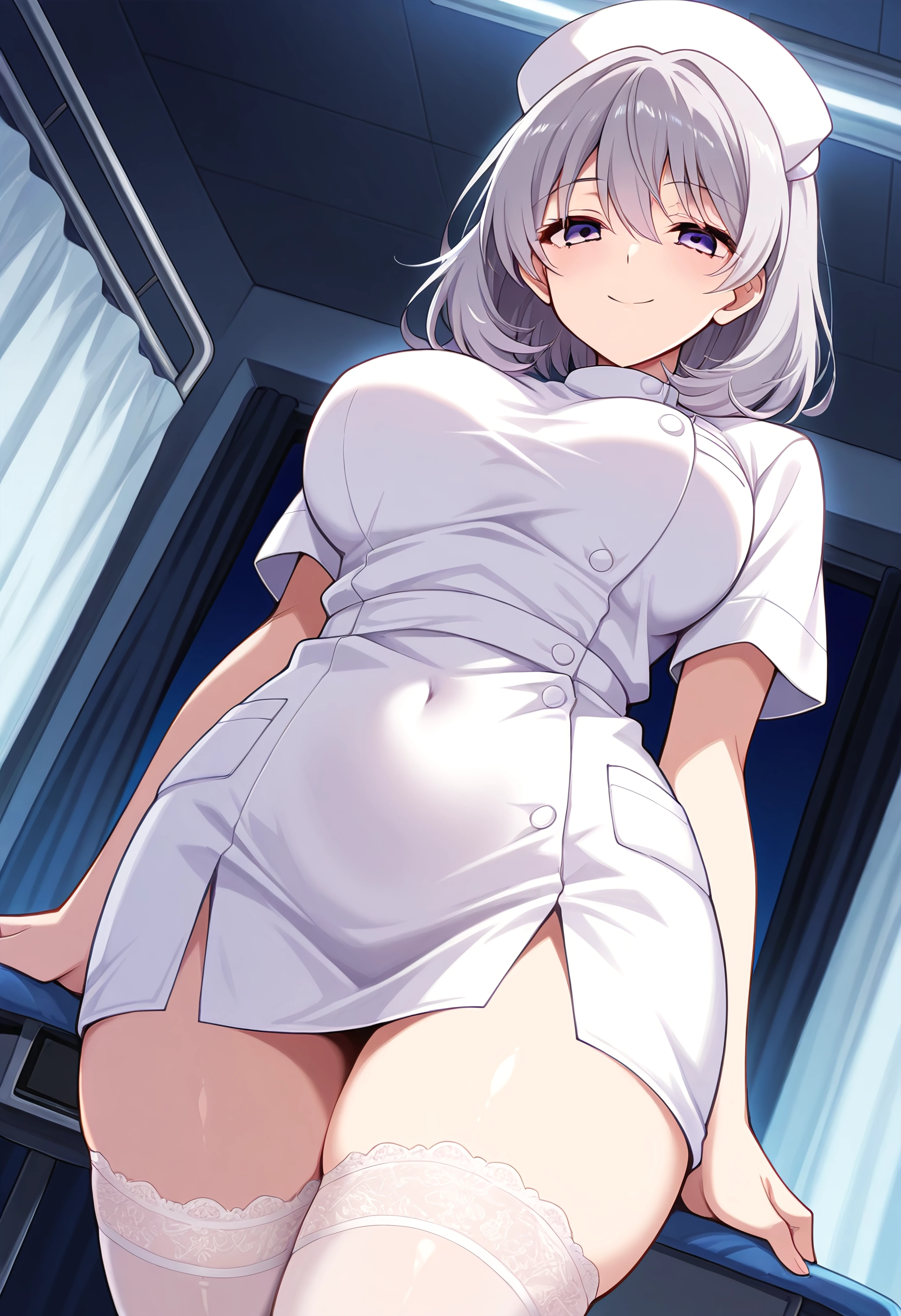 Minato Nami, 1girl, grey hair, violet eyes, white nurse cap, white nurse uniform, pockets, white pantyhose, white lace trim thighhighs