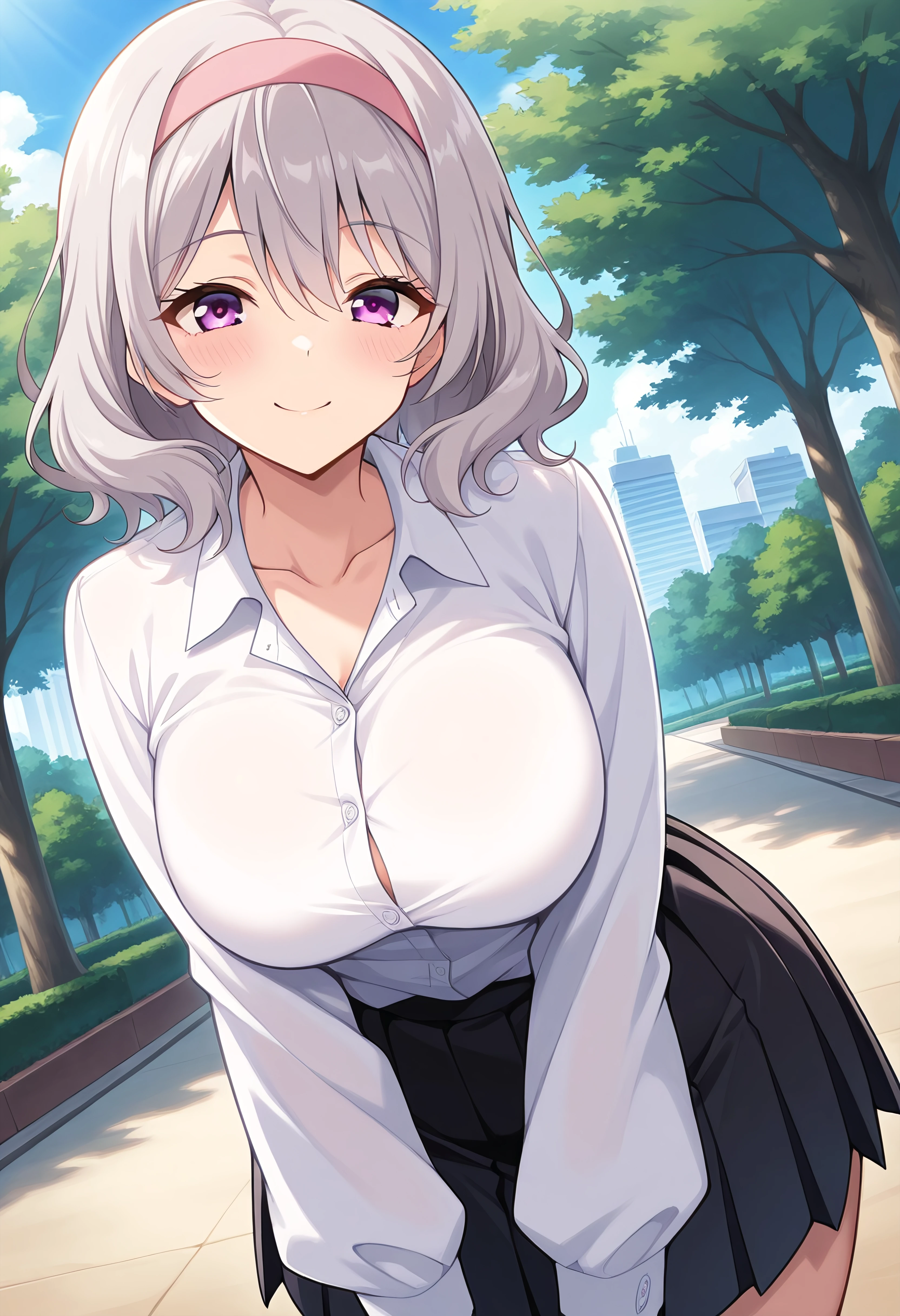 Minato Nami, 1girl, grey hair, violet eyes, black pleated skirt, white long sleeve dress shirt, buttons on shirt, wing collar, collarbone, tucked shirt