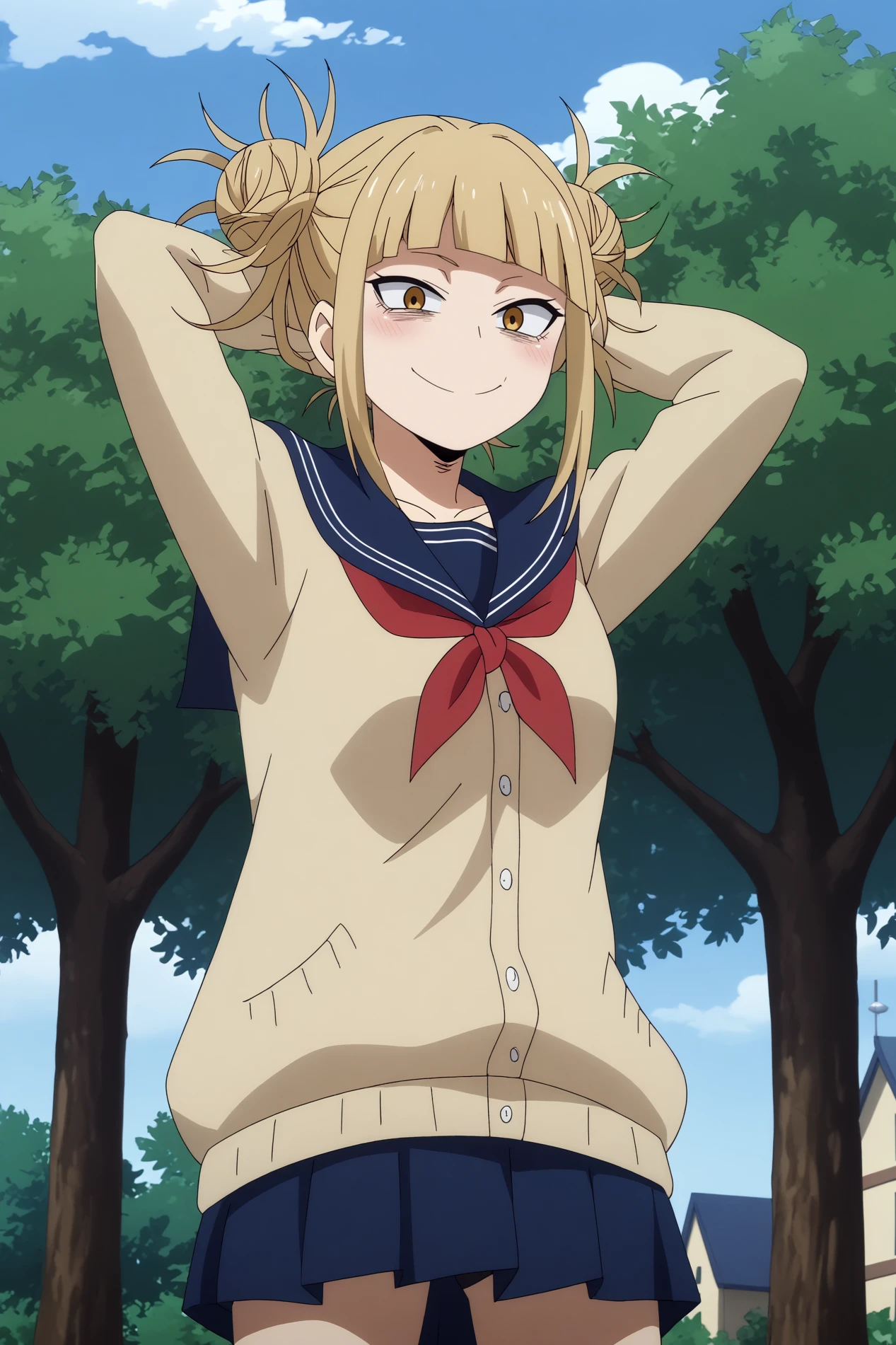 Triggers : himiko toga,1girl,solo,double bun,blonde hair,hair bun,yellow eyes,messy hair, school uniform,bags under eyes,bangs,skirt,blunt bangs,smile,cardigan,blush,socks