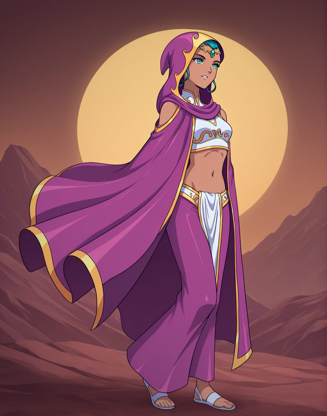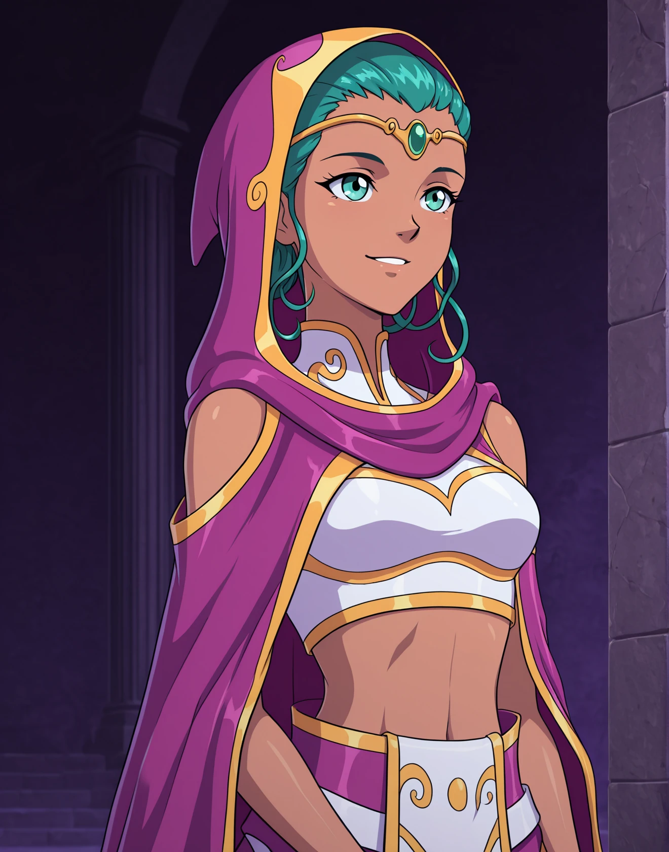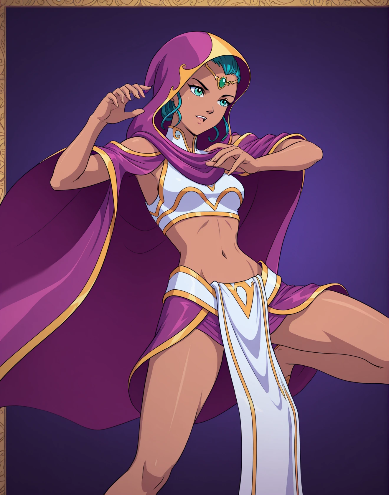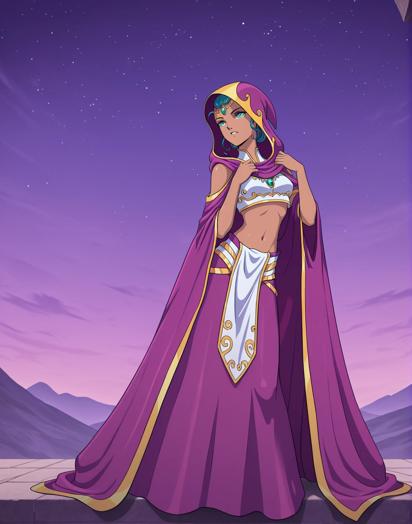 nadCoH, blue hair, blue eyes, mage, nadia, hood, forehead jewel, slicked back hair, purple cloak, purple skirt, white top with gold pattern, gold pattern, covered legs, skirt over legs, dark skin, dark-skinned female, midriff, dark skin, dark-skinned female, midriff,