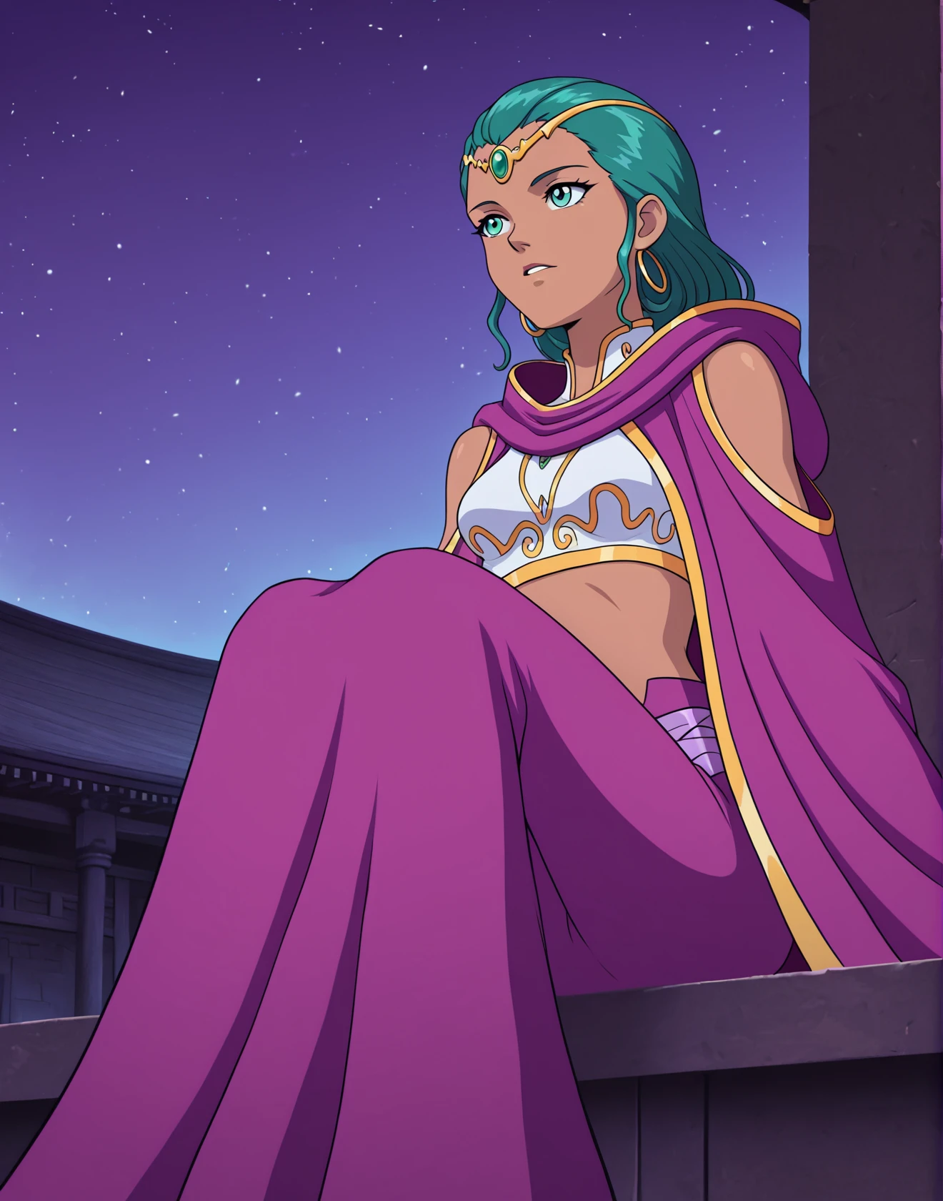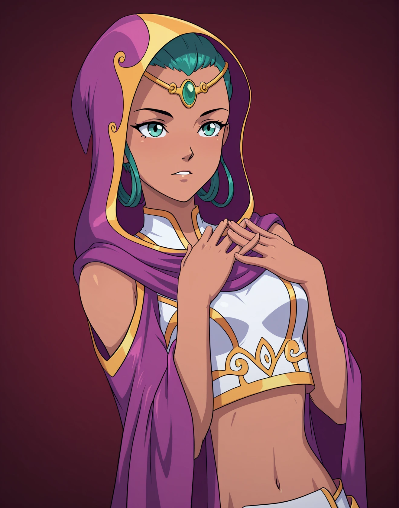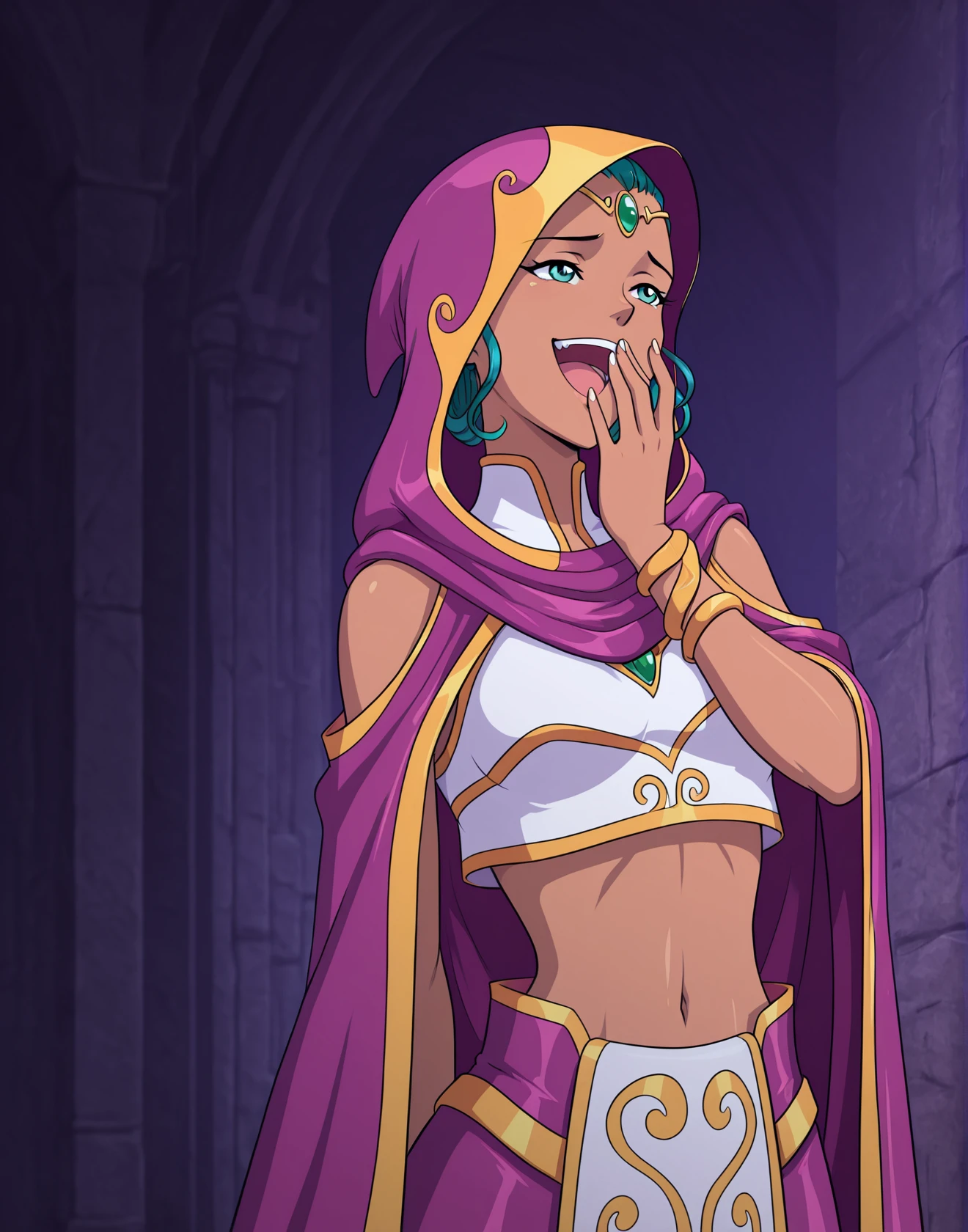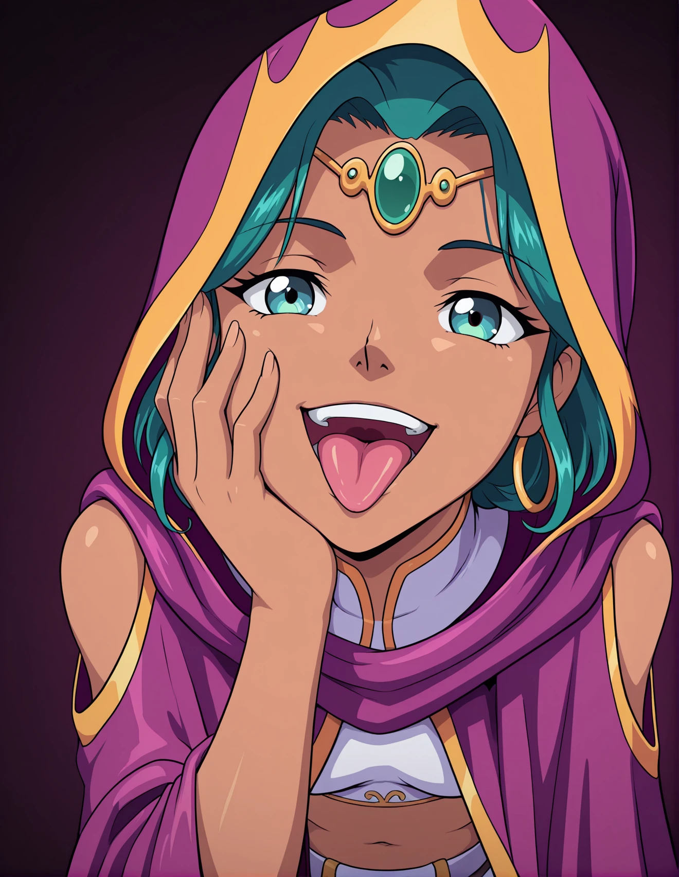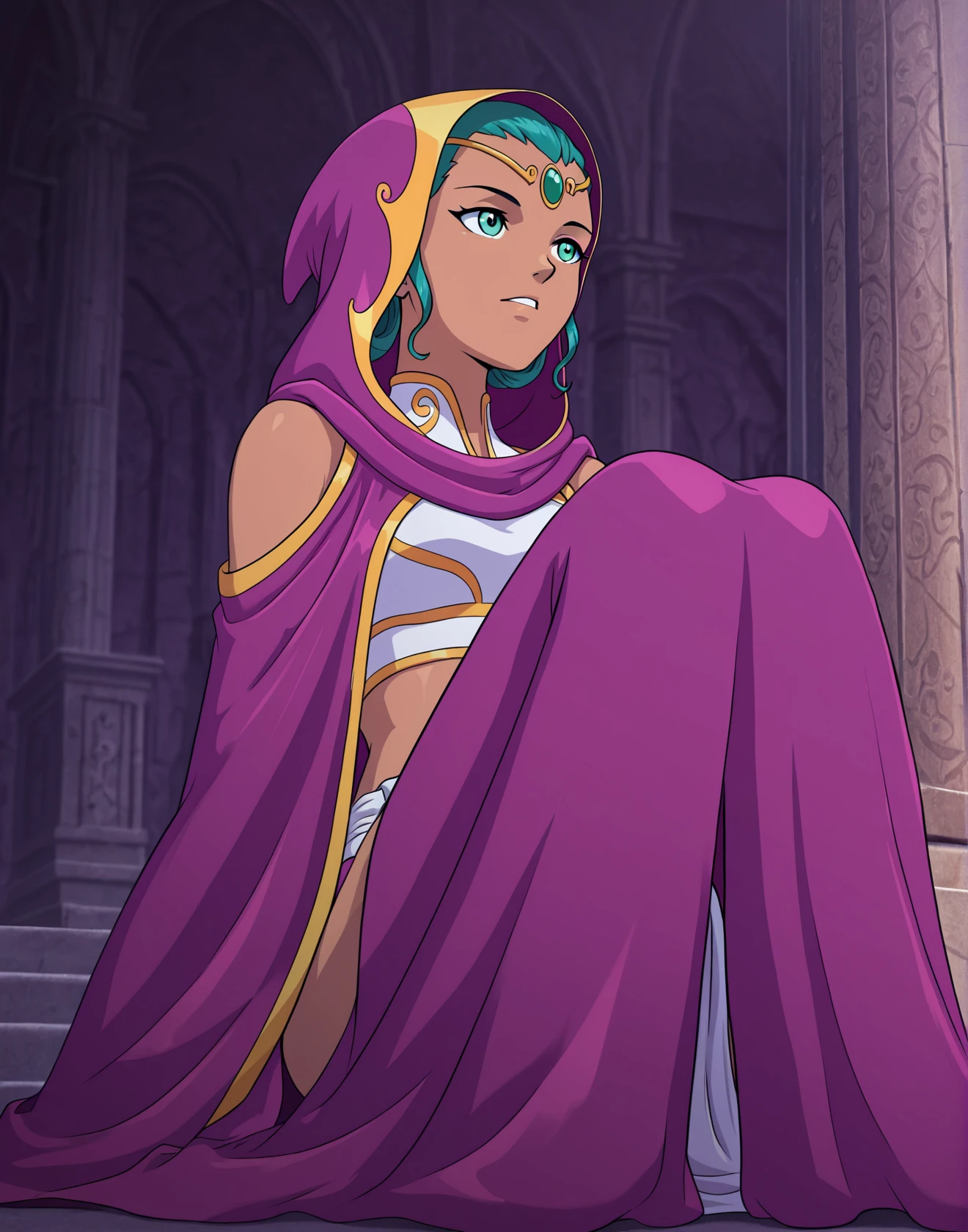 nadCoH, blue hair, blue eyes, mage, nadia, hood, forehead jewel, slicked back hair, purple cloak, purple skirt, white top with gold pattern, gold pattern, covered legs, skirt over legs, dark skin, dark-skinned female, midriff, dark skin, dark-skinned female, midriff,