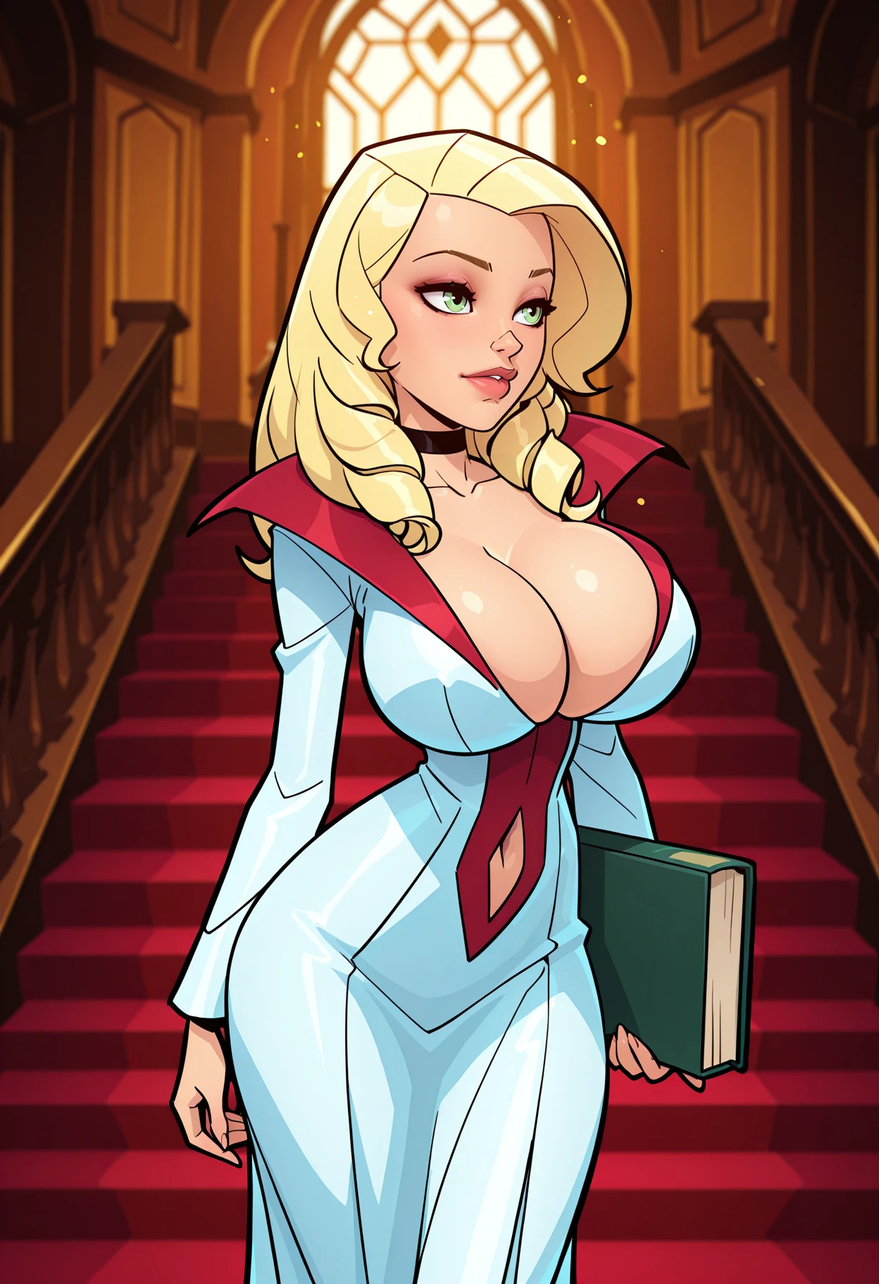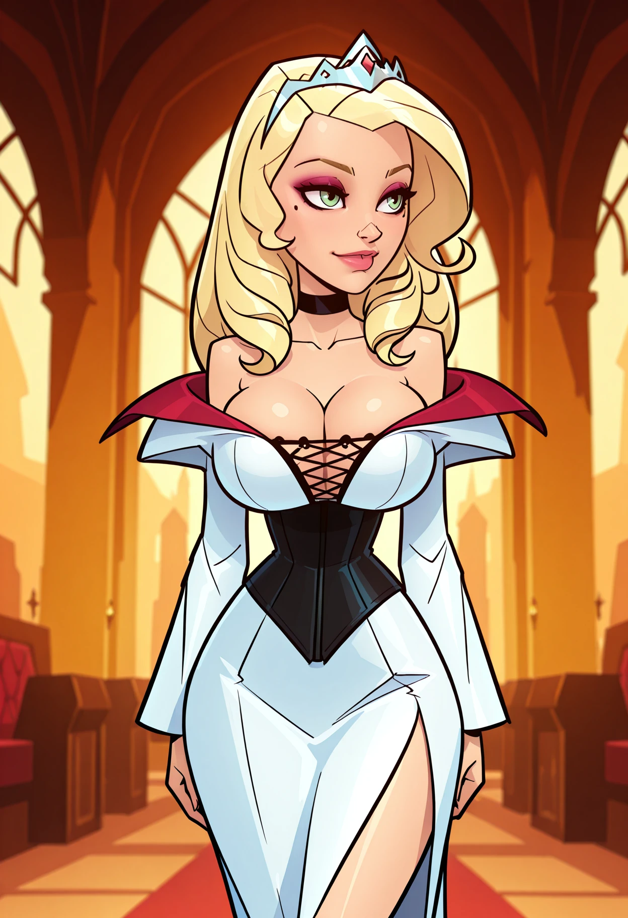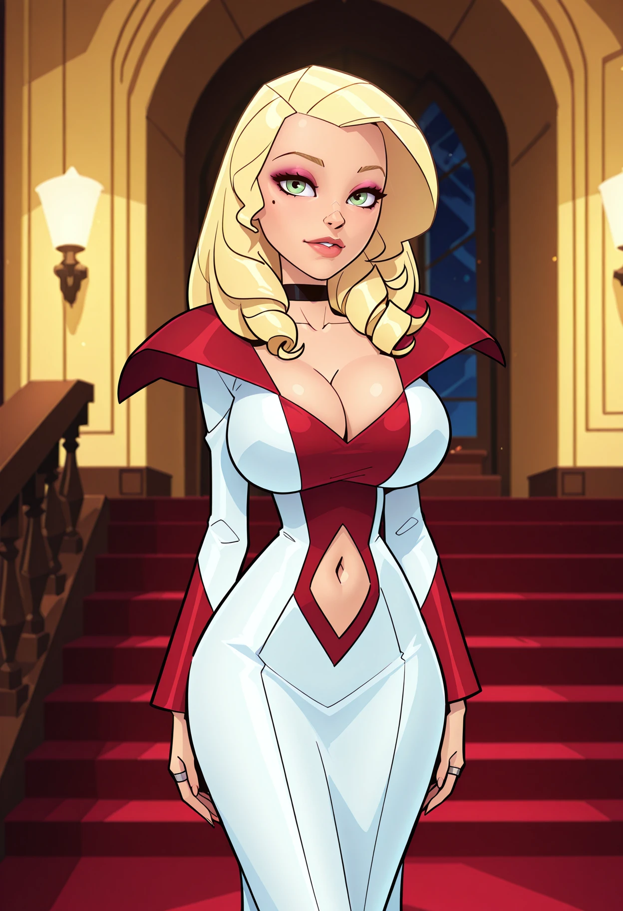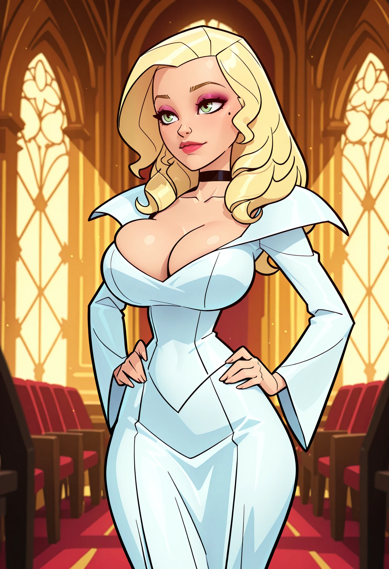 recommended tags: Princess Irulan, blonde hair, green eyes, makeup, large breasts, mole, mole under eye, choker, black choker,