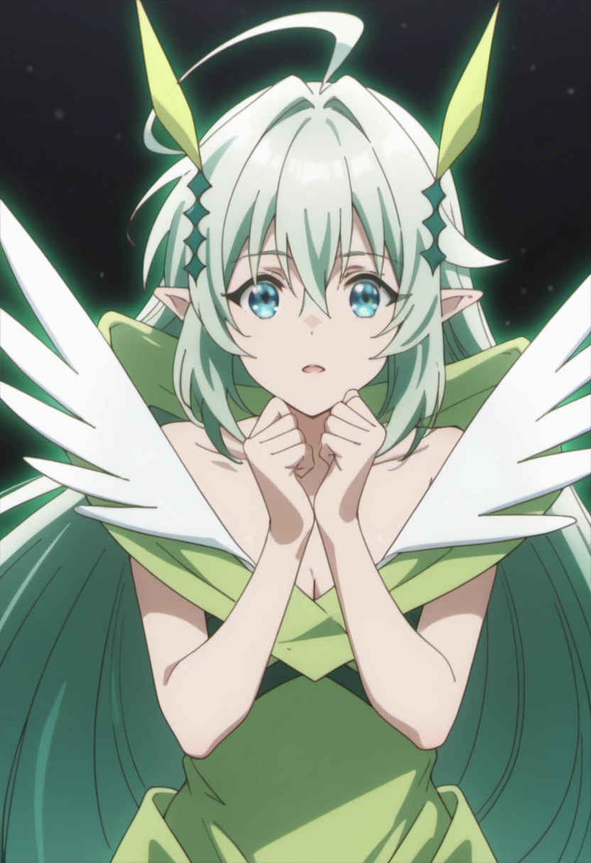 Trigger Words: airy (isekai cheat magician), long hair, green hair, blue eyes, pointy ears