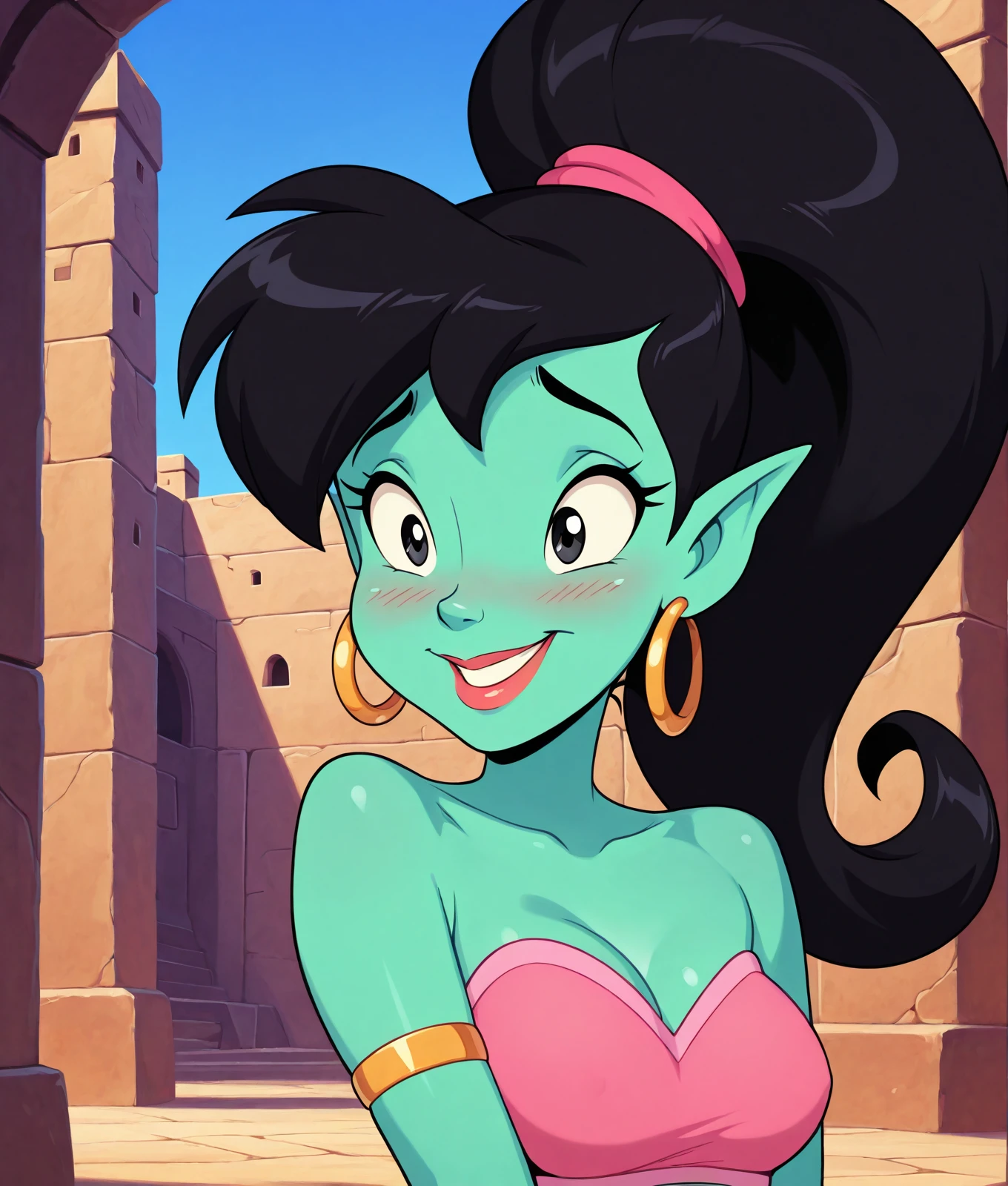 off shoulder, eden_genie_outfit, two-tone top, pink top, armlet, pink scrunchie, midriff, green harem pants,