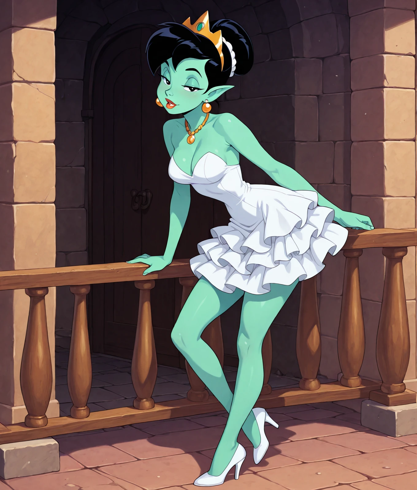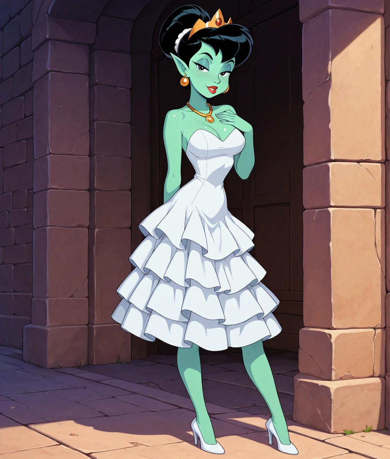gold necklace, updo, gold crown, white scrunchie, half-closed eyes, white dress, white footwear, high heels, earrings, layered dress, eden_white_dress