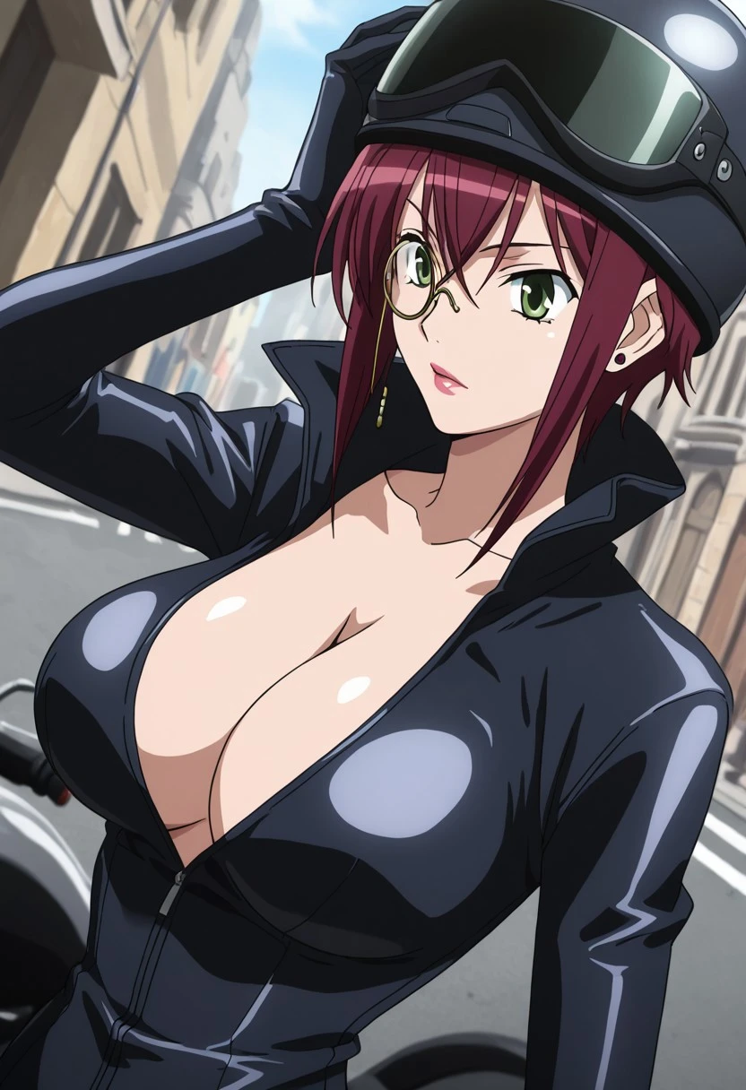 Outfit 02: Catsuit, long cleavage, motorcycle helmet on the head,