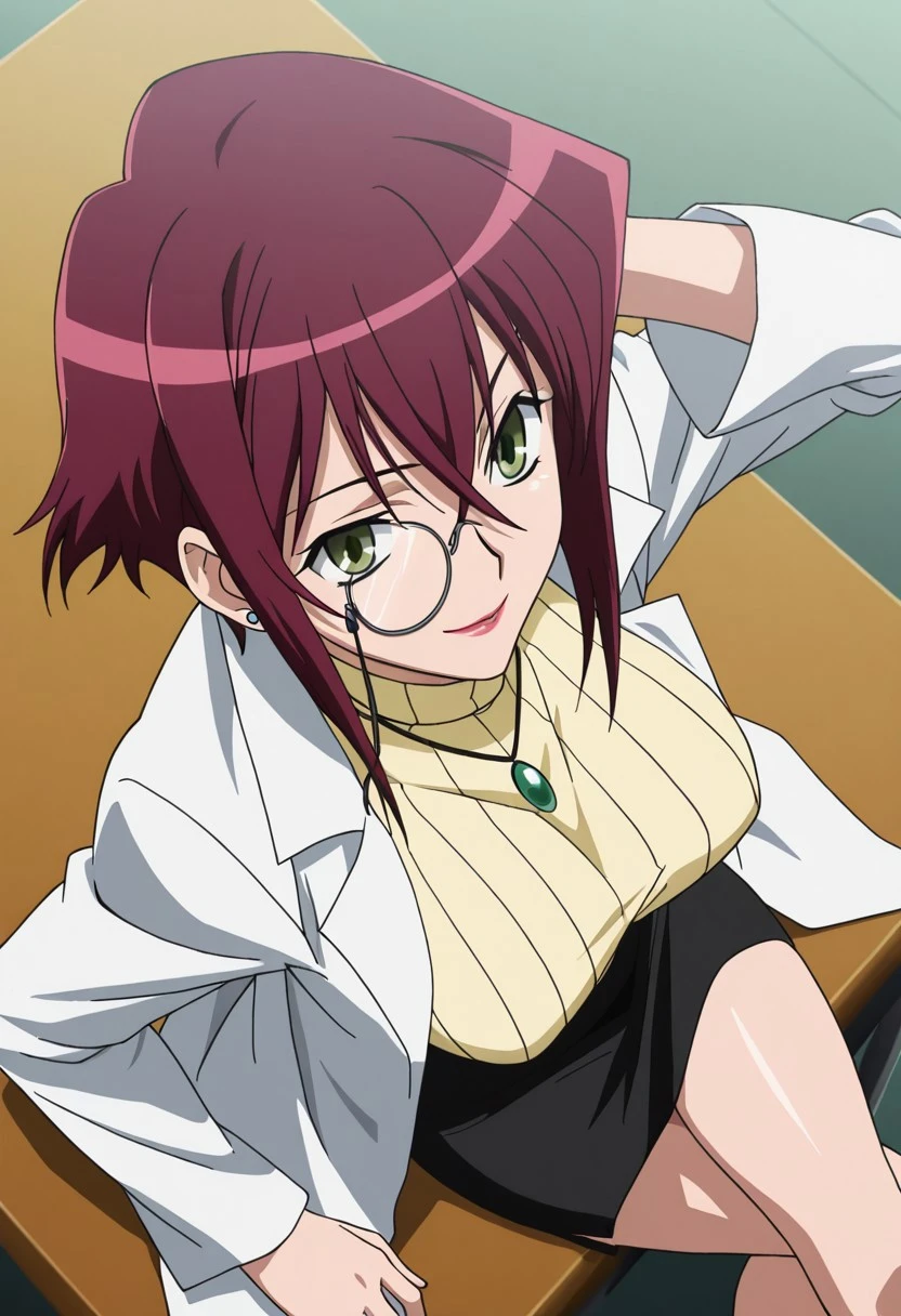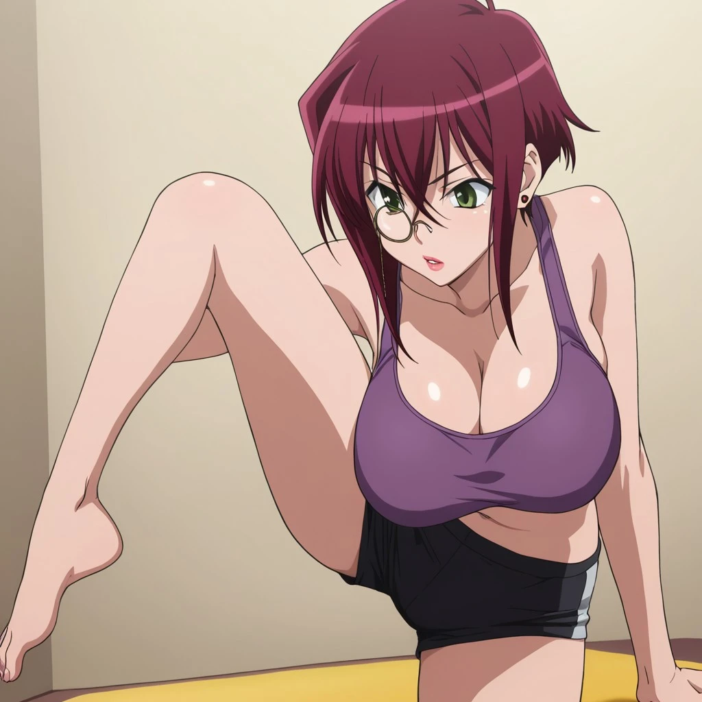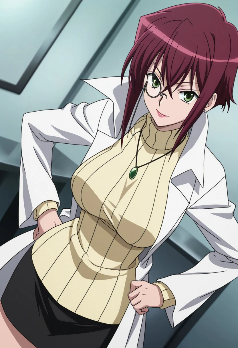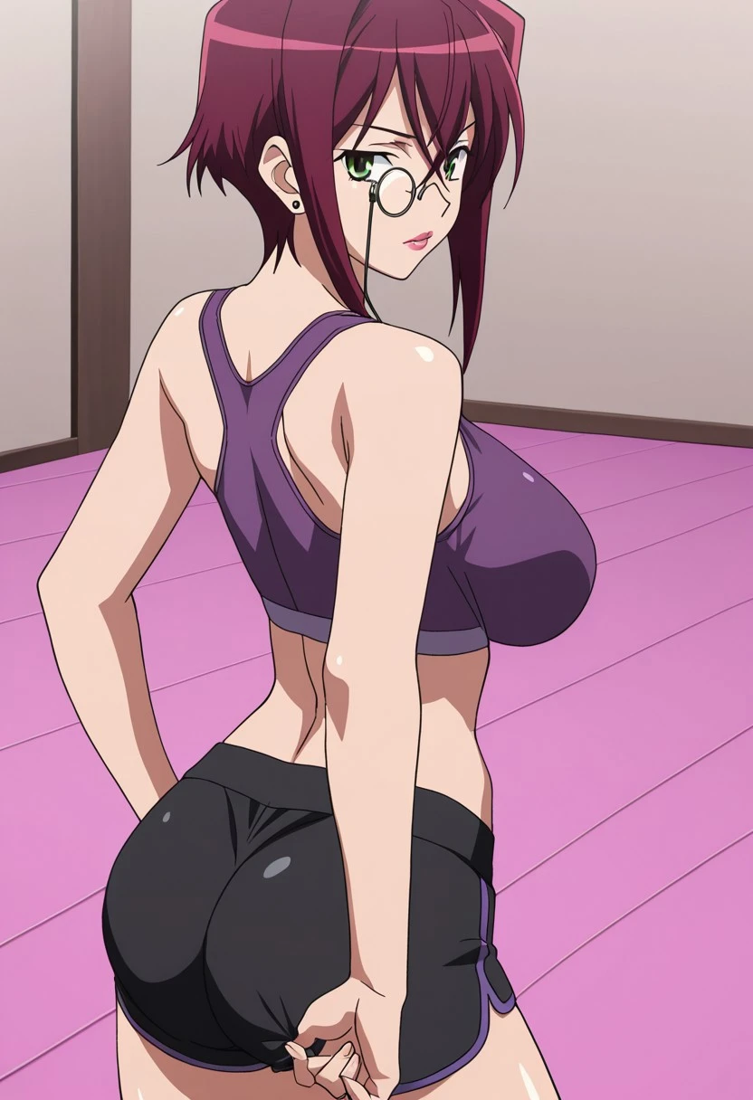 Trigger: Moriko_Tomoyose, Stud earrings on the ears, lips, monocle on the left eye, dark reddish magenta hair, short hair, olive green eyes, large breasts, mature,