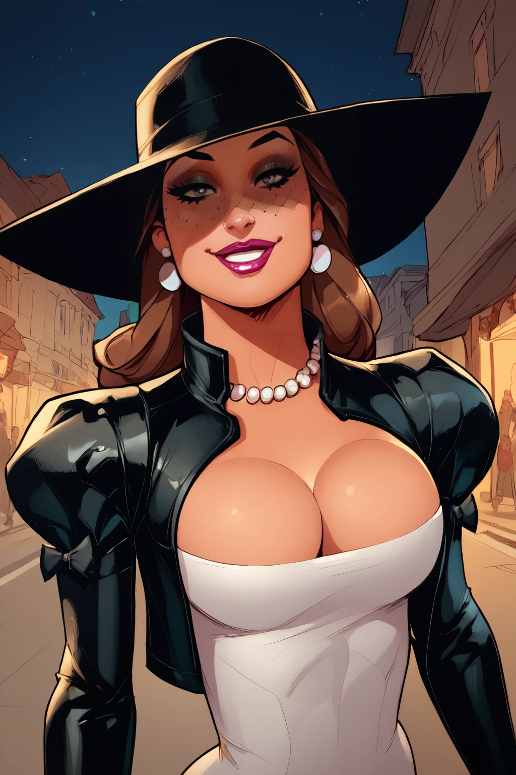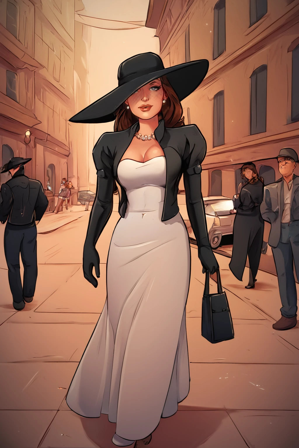 Trigger : 1girl, jacket, dress, hat with veil, juliet sleeves, gloves, necklace, earrings, thigh boots
