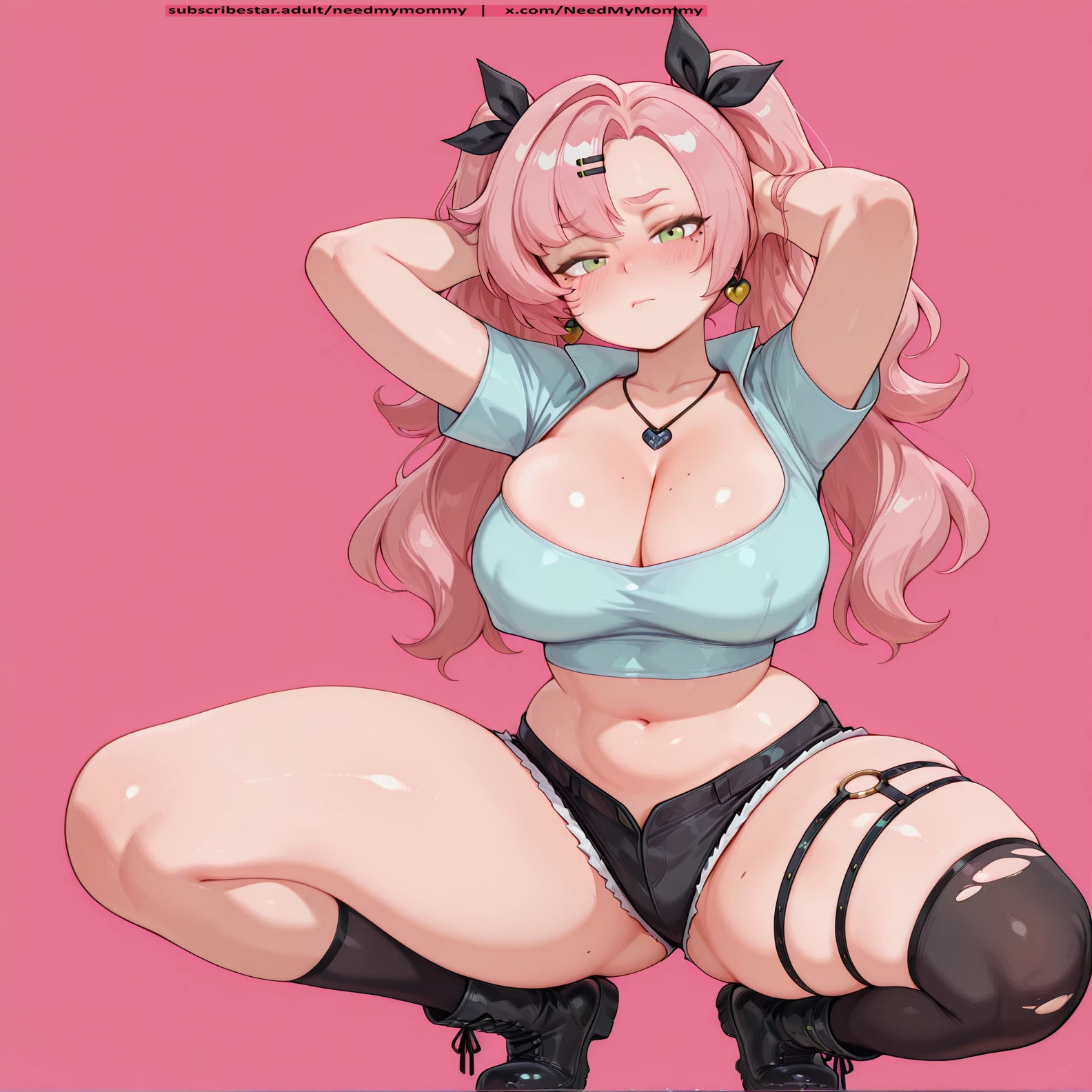 black footwear, black ribbon, black shorts, black thighhighs, boots, cleavage, crop top, kneehighs, pink nails, nail polish, necklace, short shorts, shorts, single kneehigh, single thighhigh, thigh strap, thighhighs, torn clotches,