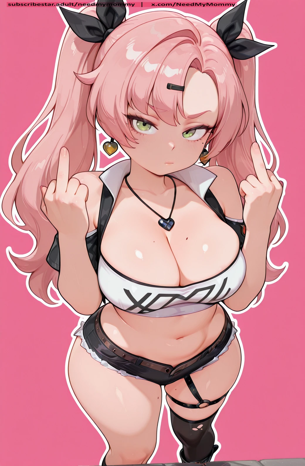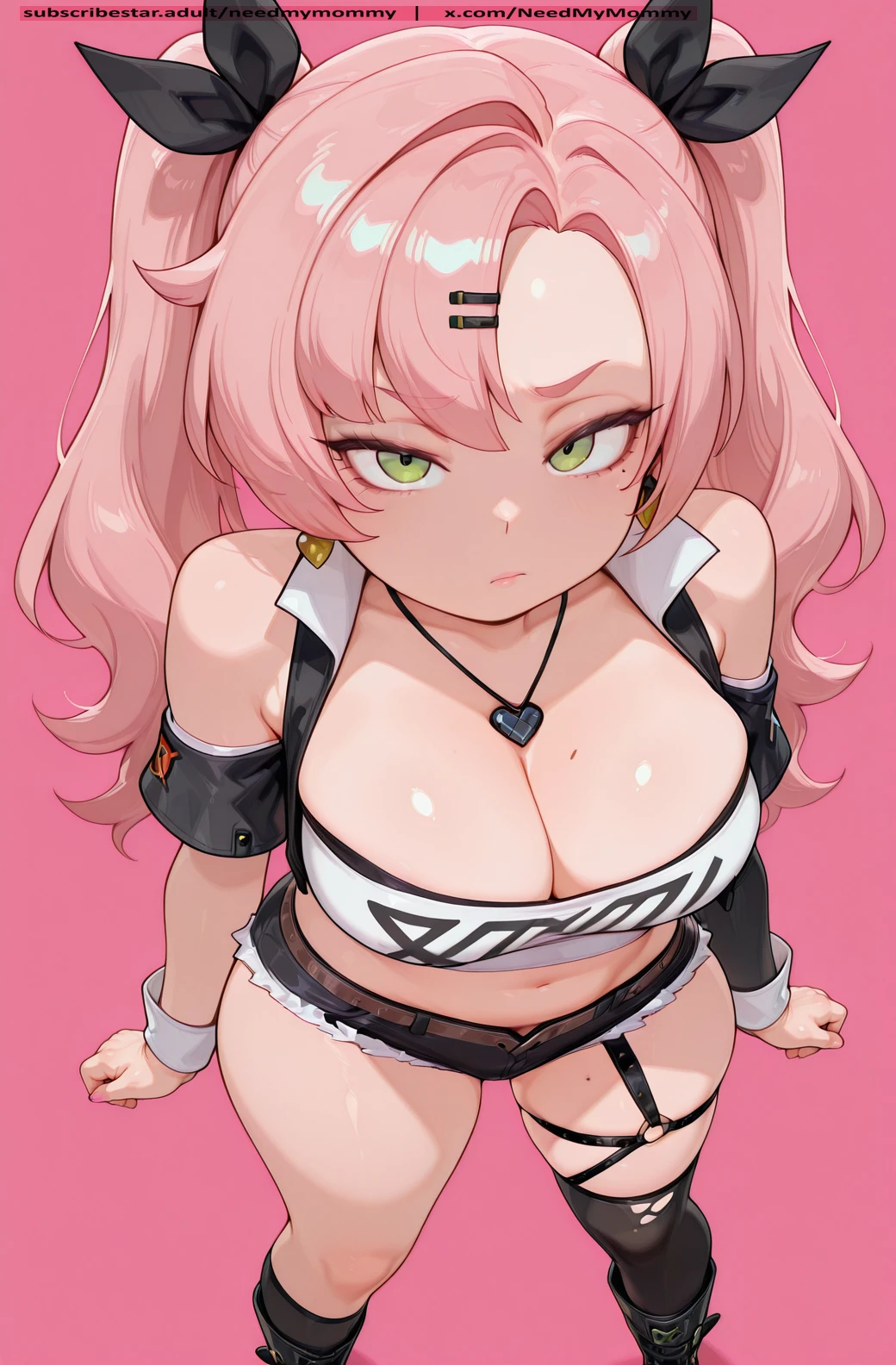 twintails, green eyes, pink hair, hair ornament, hair ribbon, hairclip, long hair, mole, mole on breast, mole on thigh, mole under eye, ribbon, earrings, jewellery,