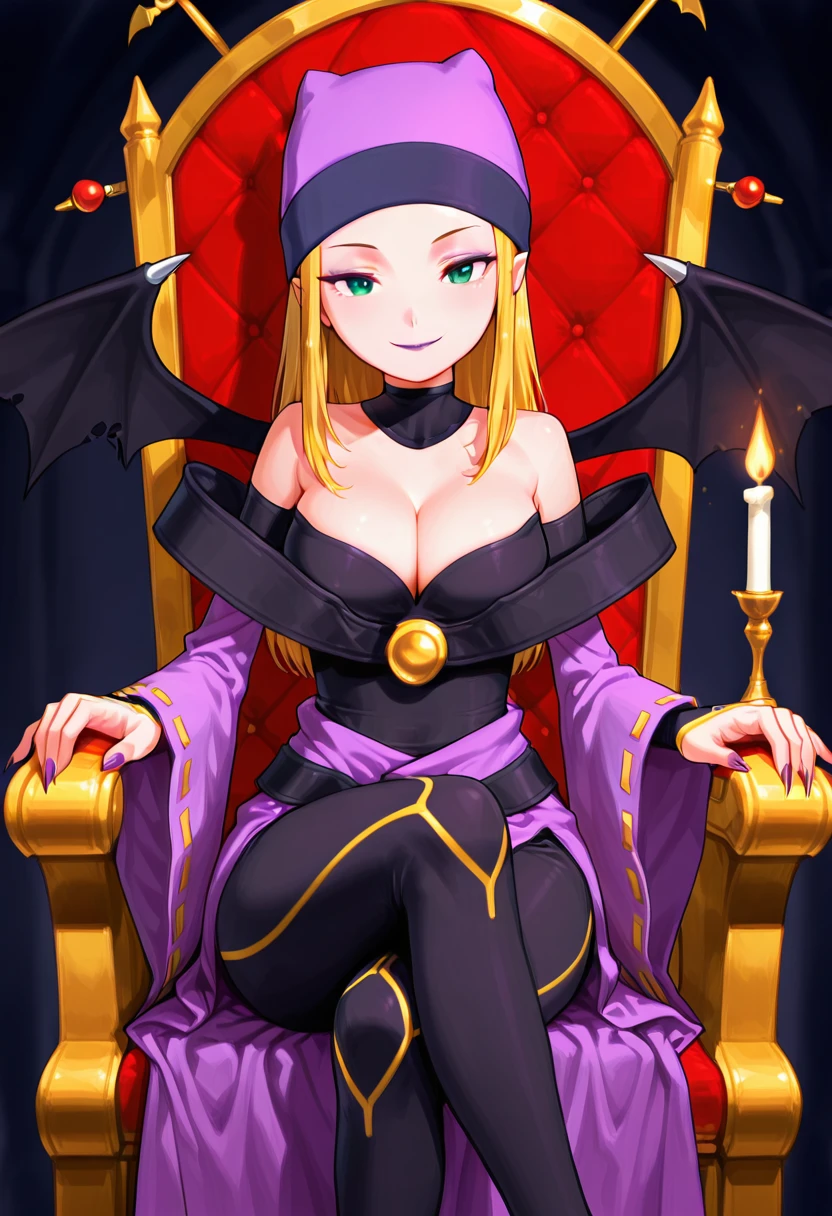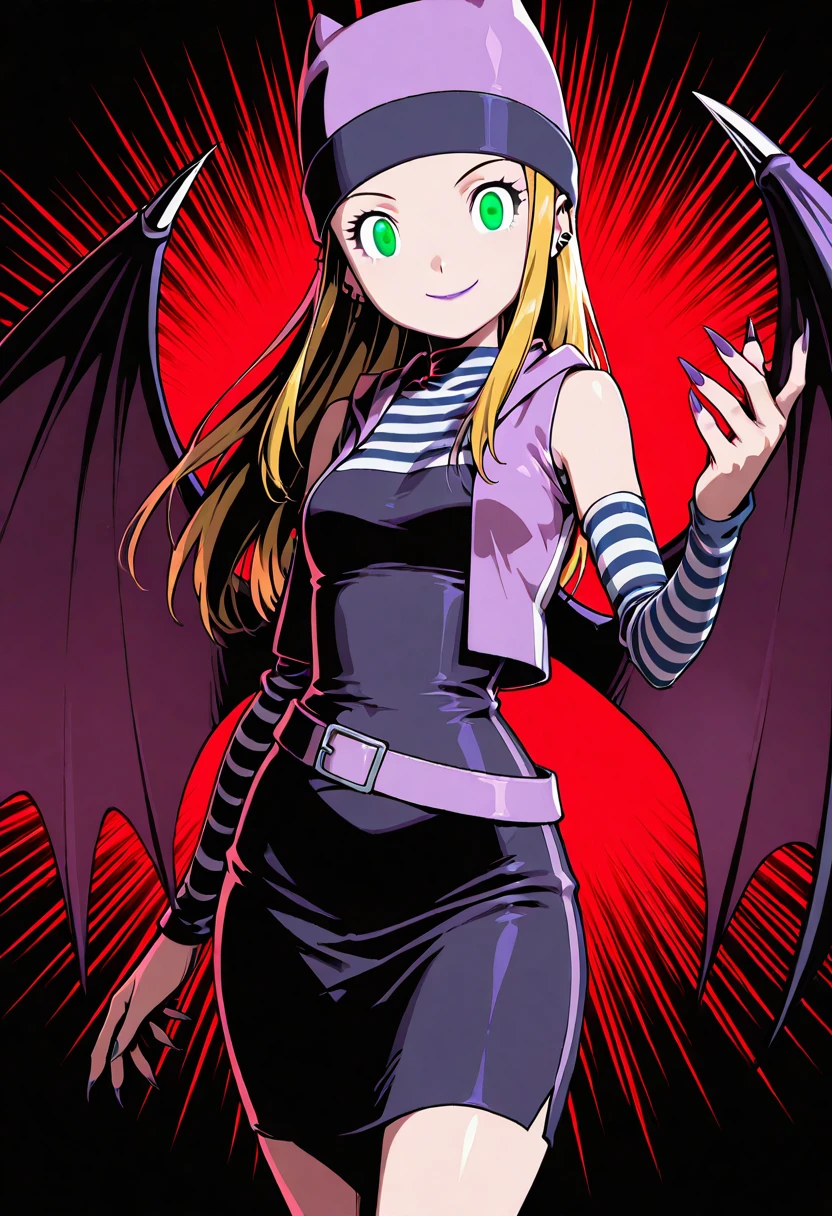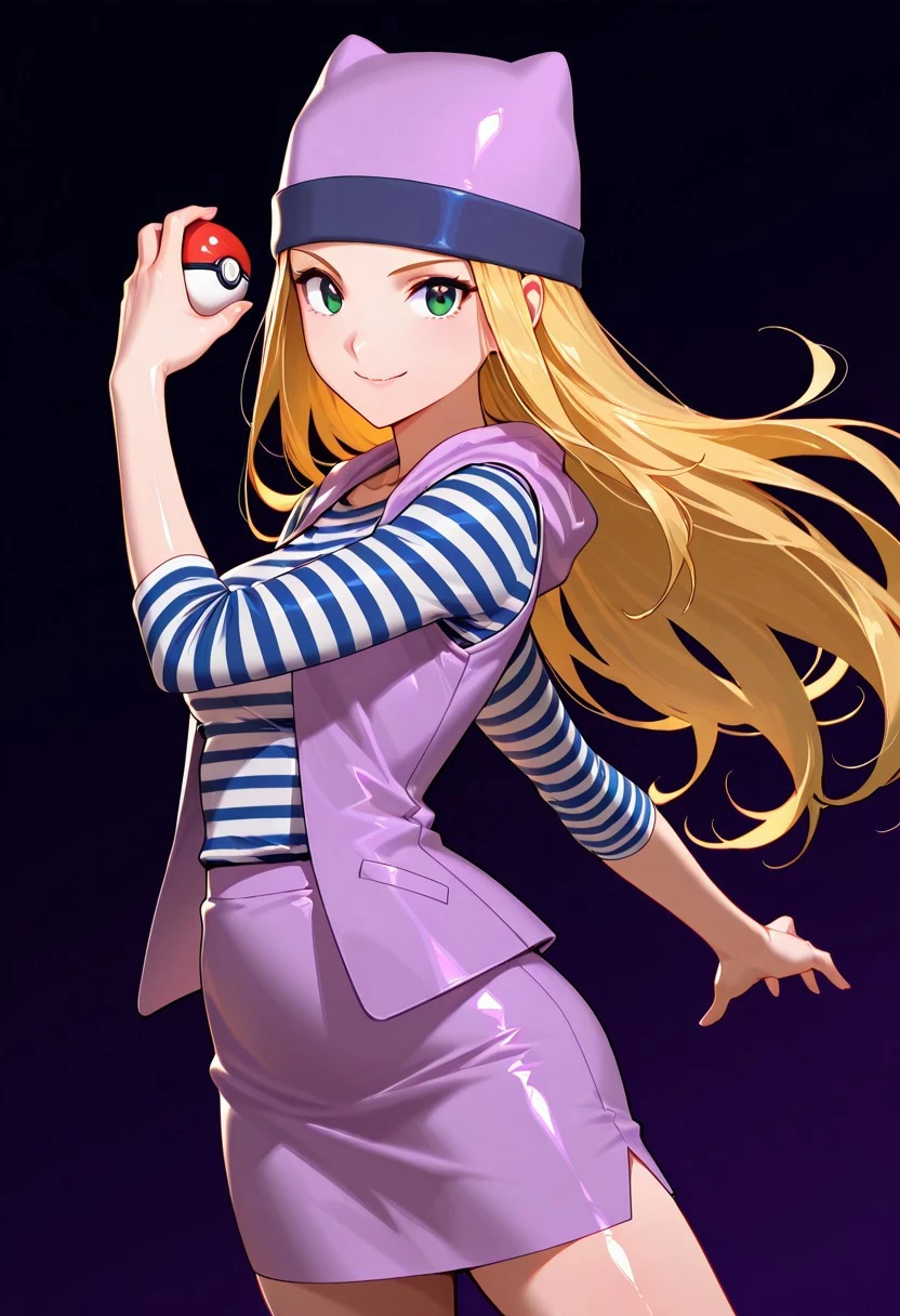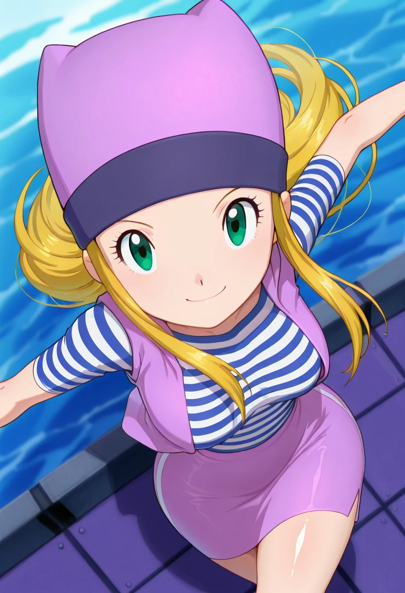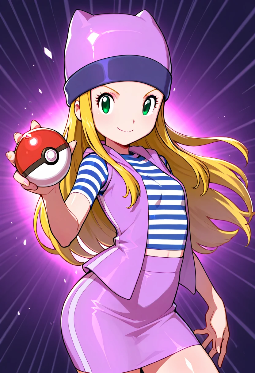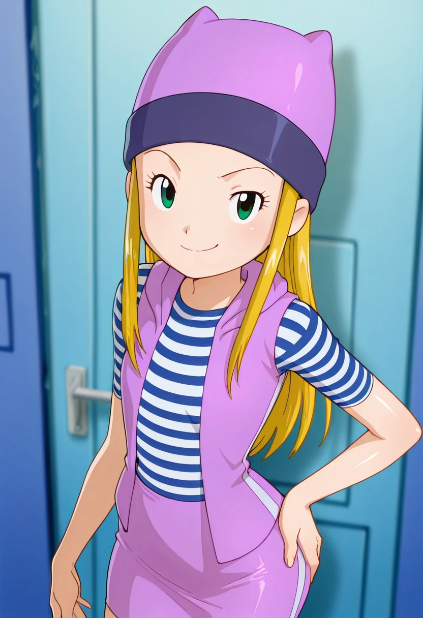 zzIzumi, green eyes, blonde hair, long hair, purple vest, striped shirt, hat, skirt,