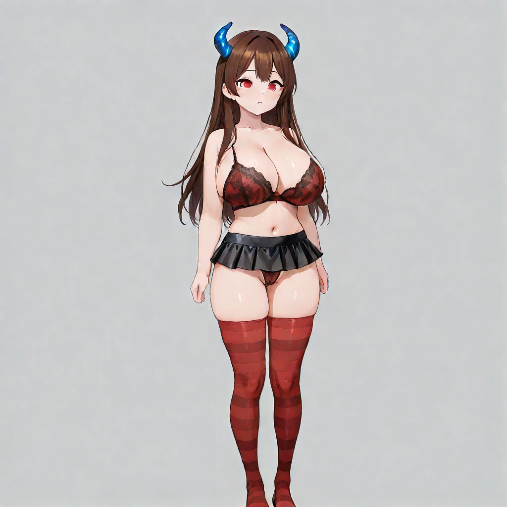 yami, 1girl, solo, blue horns, highres eyes, brown hair, thighhighs, clean white hoodie, black micro skirt,