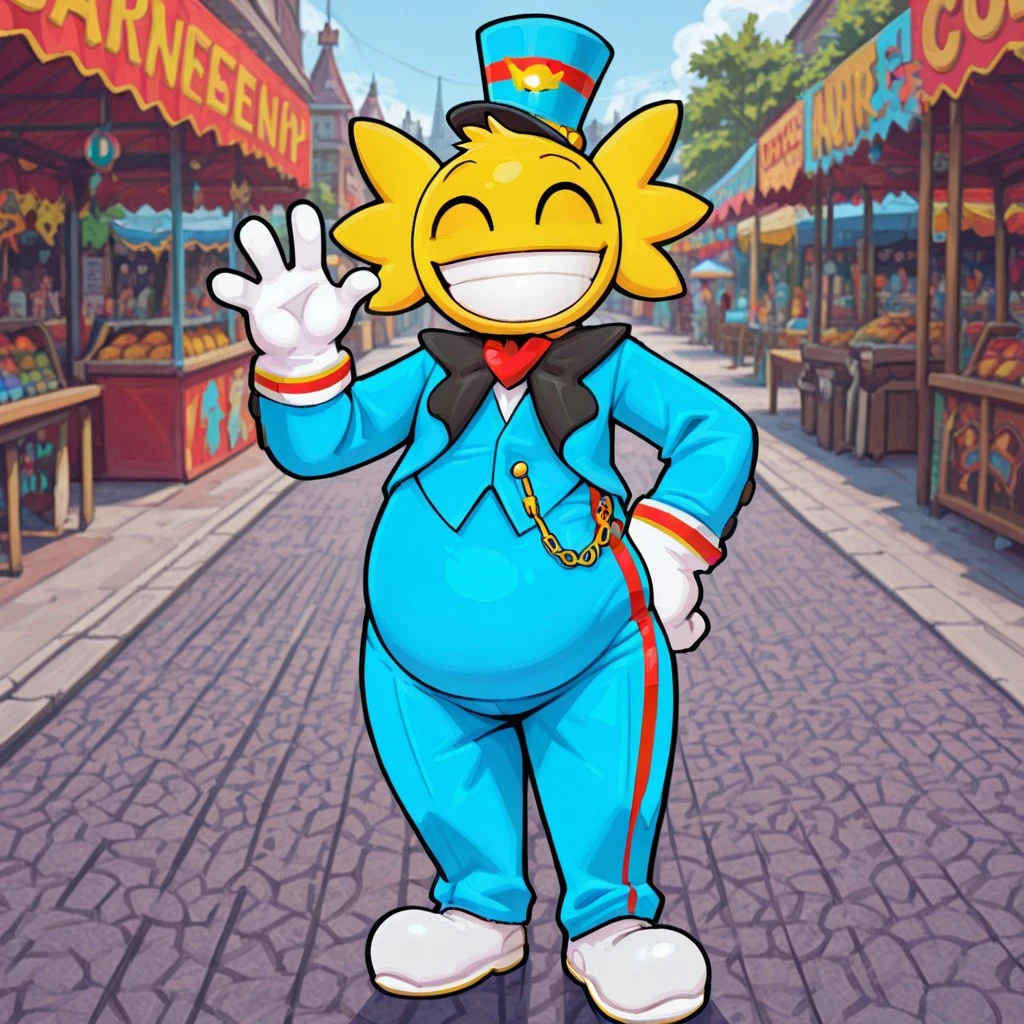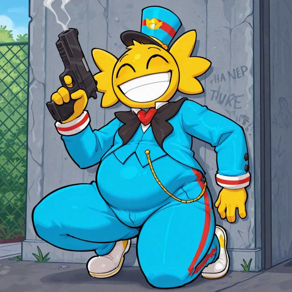 wonkeefn, yellow body, eyes closed, smile, teeth,